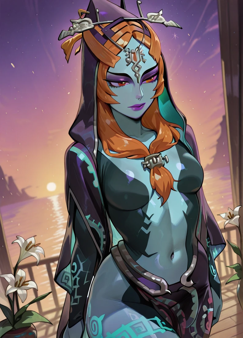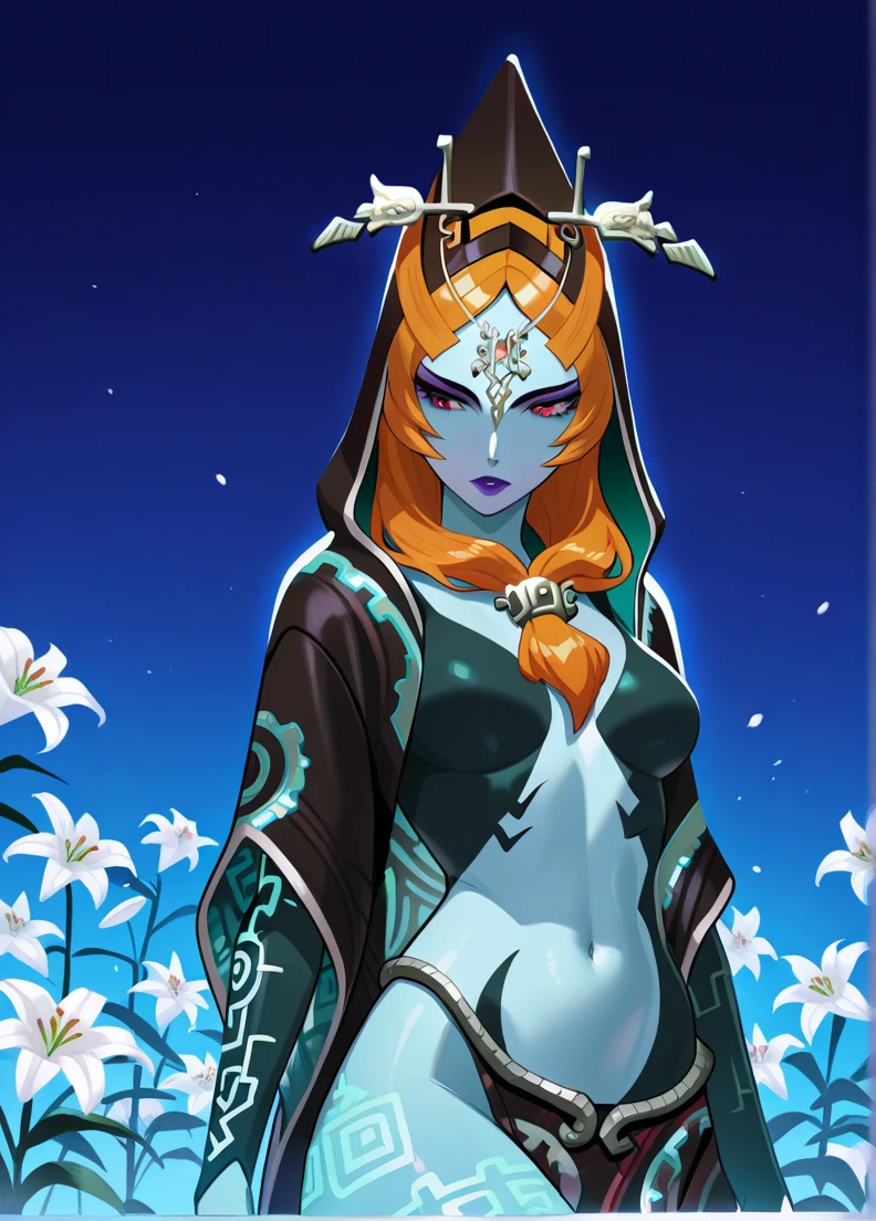 midnaxd, 1girl, solo, yellow sclera, front ponytail, colored skin, orange hair, colored sclera, purple lips, blue skin,, red eyes, long hair, tatoo