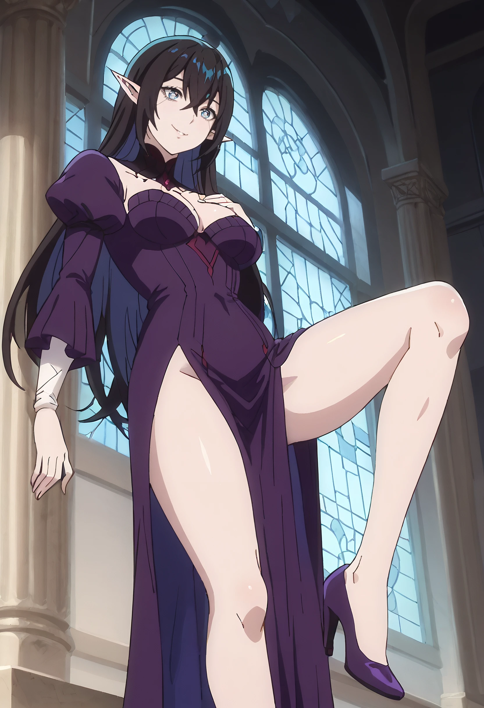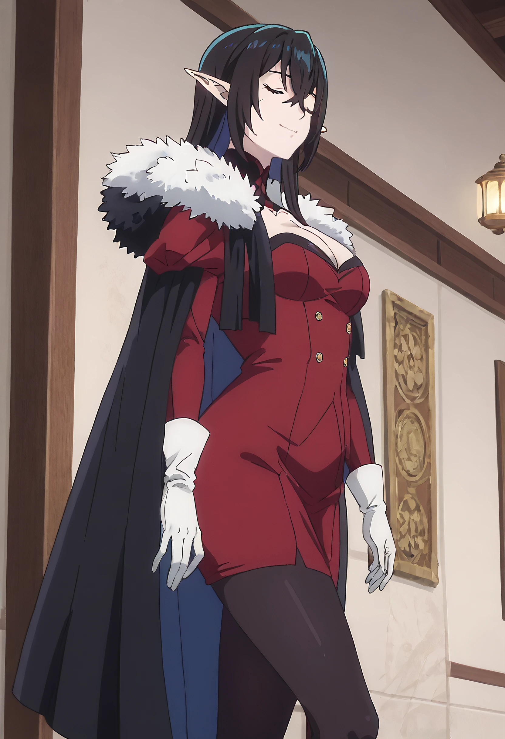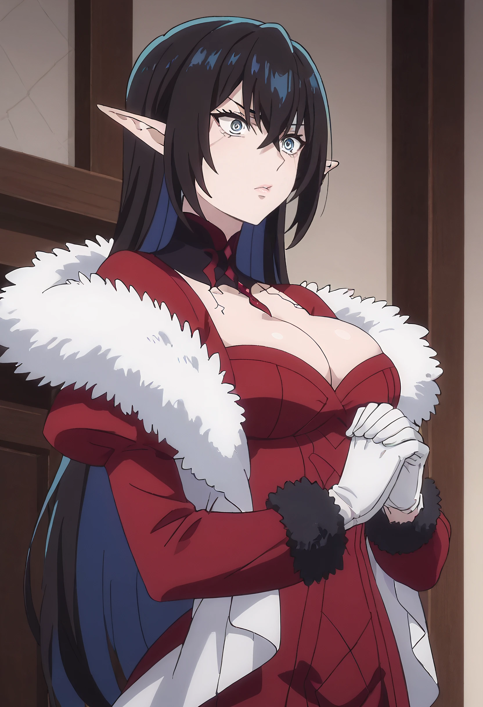 DL2Tratte, elf, long hair, long pointy ears, pointy ears, black hair, hair between eyes, blue eyes, bangs,