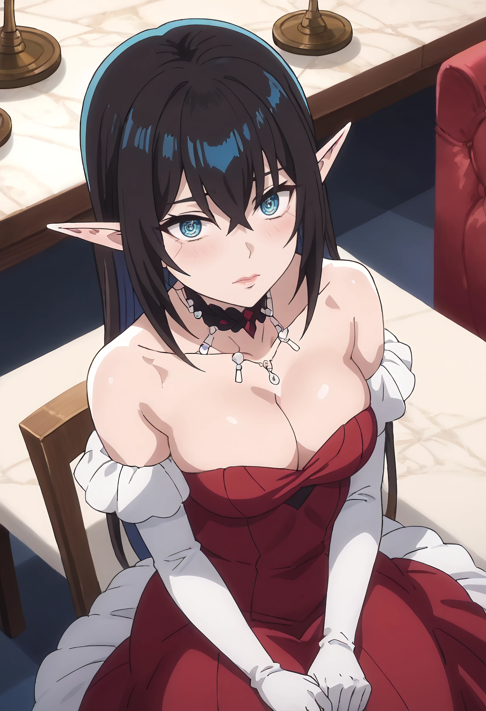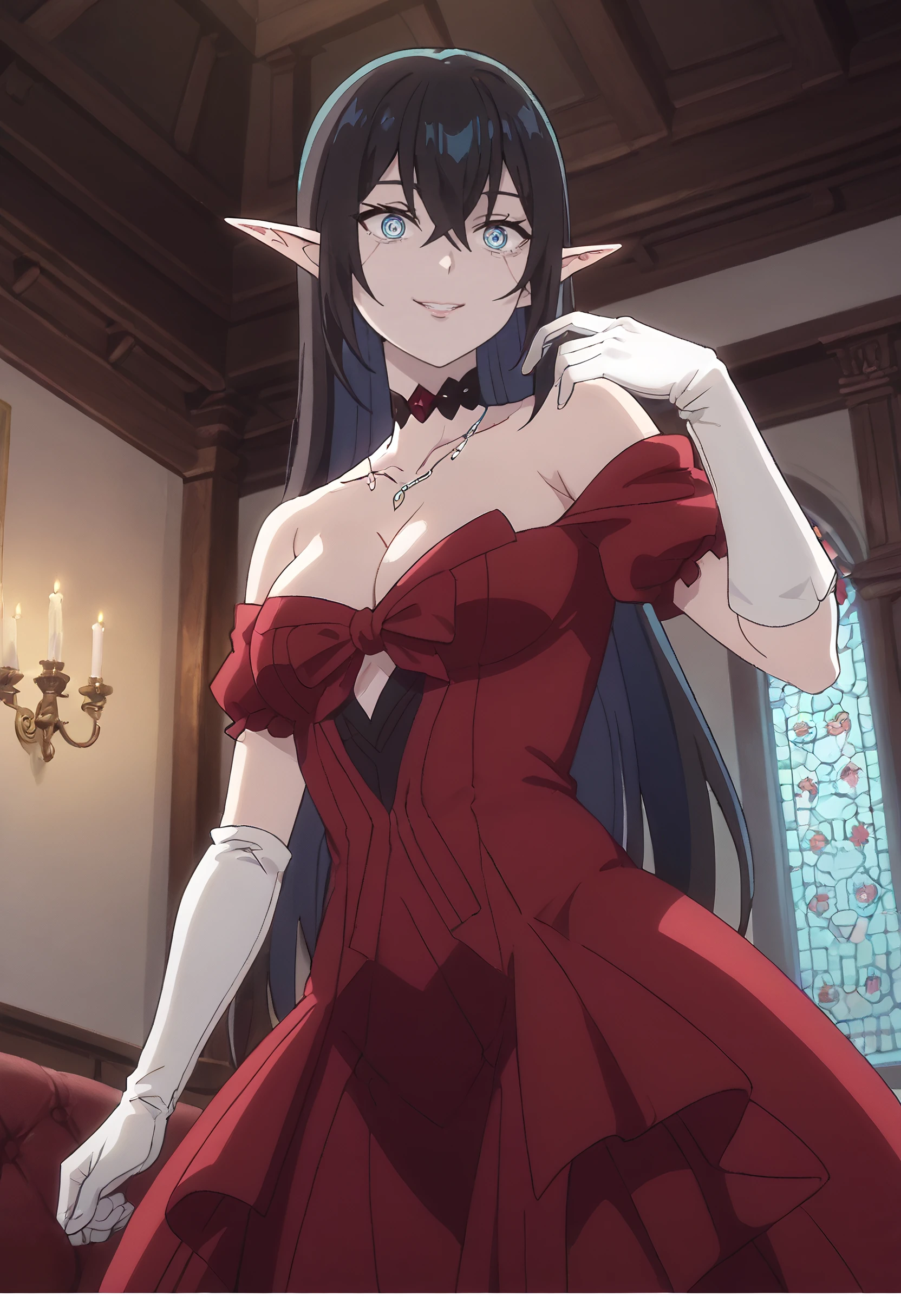 TratteDress, cleavage, bare shoulders, dress, gloves, collarbone, red dress, off shoulder, white gloves, elbow gloves, strapless, jewelry, necklace, long dress, choker,