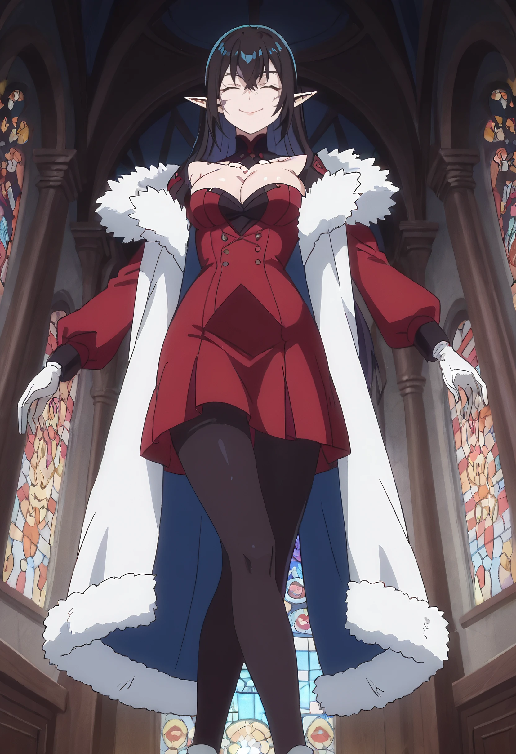 TratteJacket, fur-trimmed jacket, fur trim, fur collar, fur-trimmed sleeves, fur-trimmed coat, fur coat, fur, coat, gloves, skirt, white gloves, black legwear, red skirt, cleavage, white footwear, red sleeves, pantyhose,