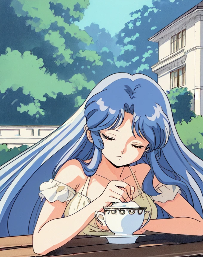 b-ko, 1girl, solo, closed eyes, upper body, blue hair, long hair, curled bangs, cream summer dress, outdoors, drinking tea, mansion in background, 80s theme