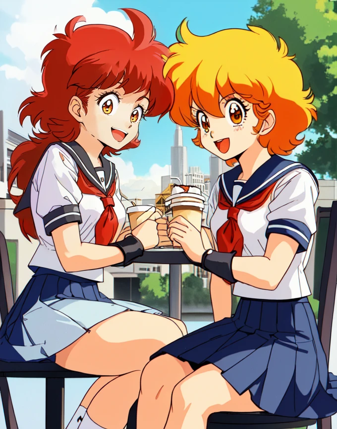 a-ko, 1girl, red medium messy hair, white blouse, short sleeves, blue collar, red neck scarf, long blue skirt, white knee high socks, black bracers, black shoes, happy, outdoors in the city,