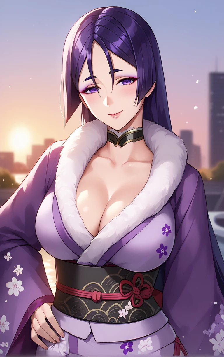 japanese clothes, sash, obi, hair ornament, purple kimono, floral print, cleavage, hair flower, long sleeves, wide sleeves, fur trim, kimono,