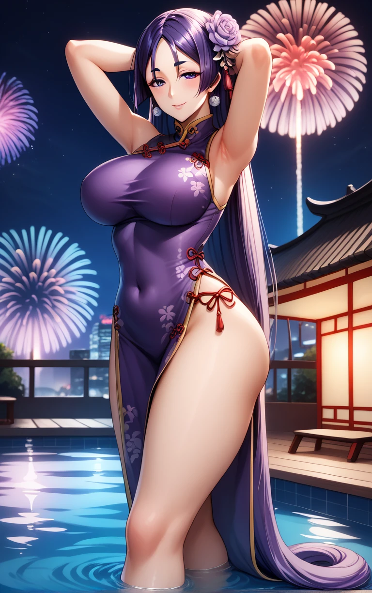 1girl, minamoto no raikou (fate), parted bangs, purple eyes, purple hair, large breasts, long hair, mature female, curvy, hair between eyes,