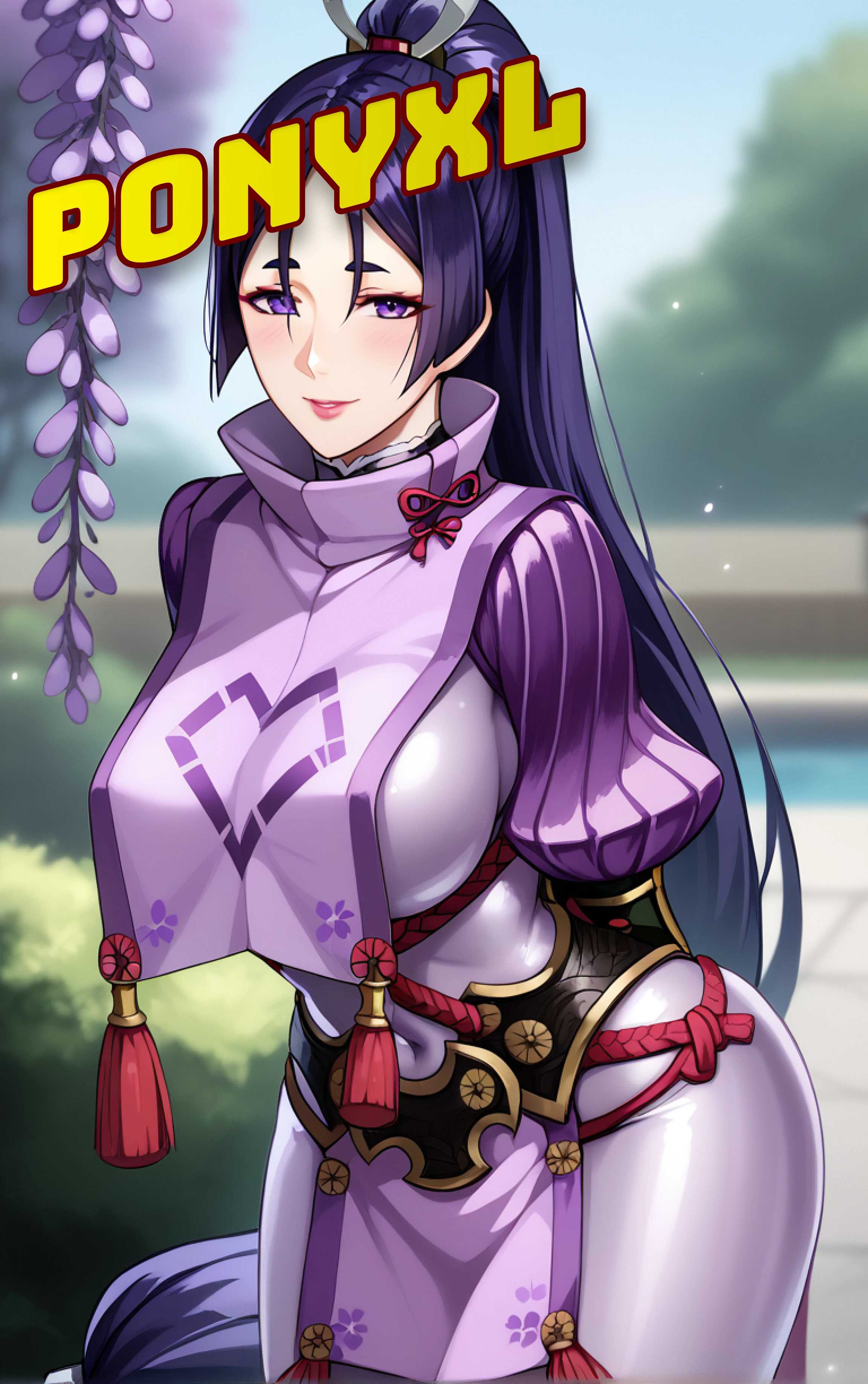 1girl, minamoto no raikou (fate), purple hair, parted bangs, purple eyes, large breasts, thighs, high collar, curvy, hair between eyes, long hair, makeup, bangs, lipstick, low-tied long hair, ponytail,