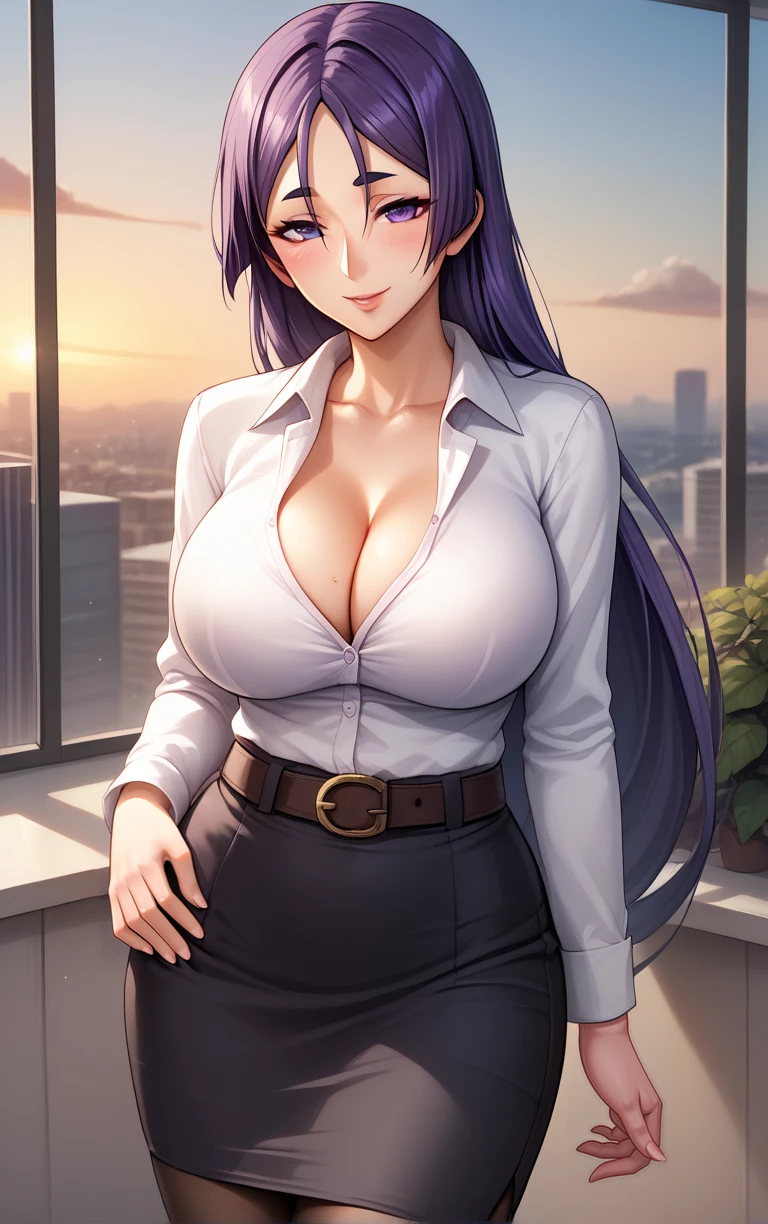 white shirt, collared shirt, office lady, black skirt, pencil skirt, dress shirt, long sleeves, shirt tucked in, belt, black pantyhose, cleavage, formal, bursting breasts,