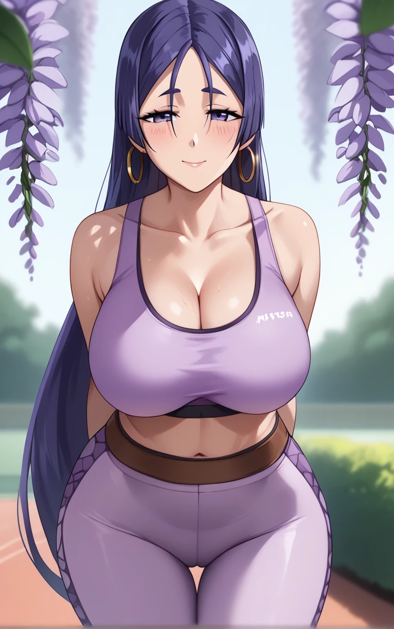 1girl, minamoto no raikou (fate), parted bangs, purple eyes, purple hair, collarbone, large breasts, curvy, hair between eyes, hoop earrings, large areolae, mature female, thick thighs, very long hair