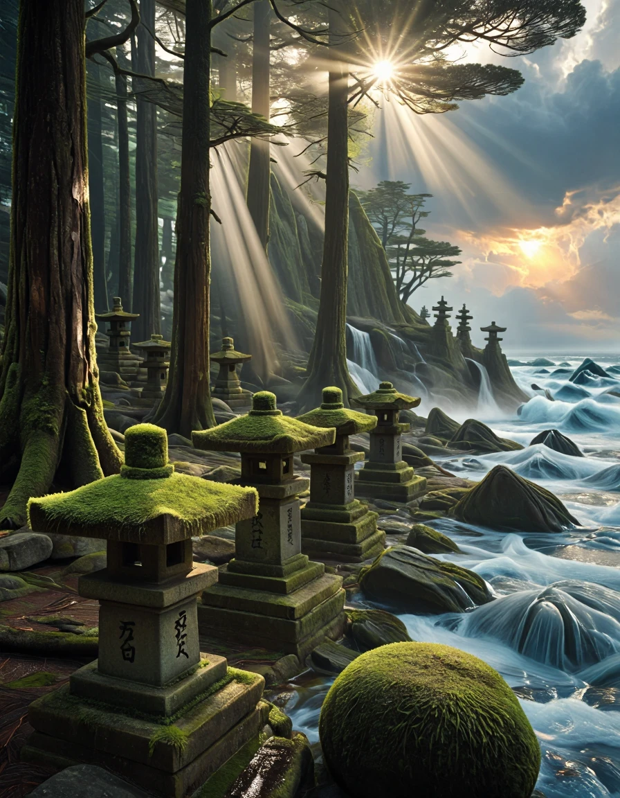 T10, landscape, mountains, waves, rocks, tree, vegetation, moss, rough sea, waterfall, ruins, sunset, blue, orange, yellow, brown,