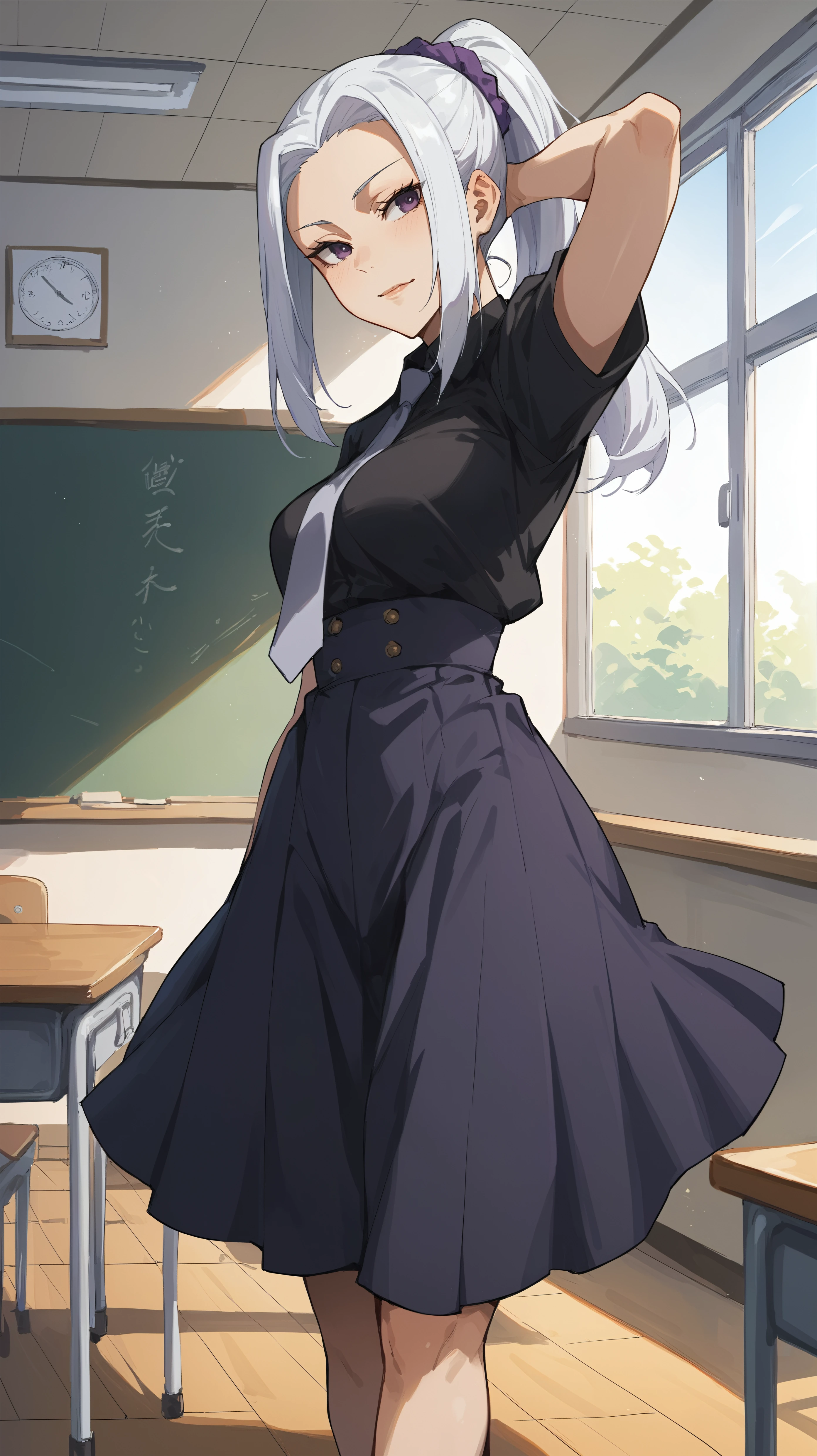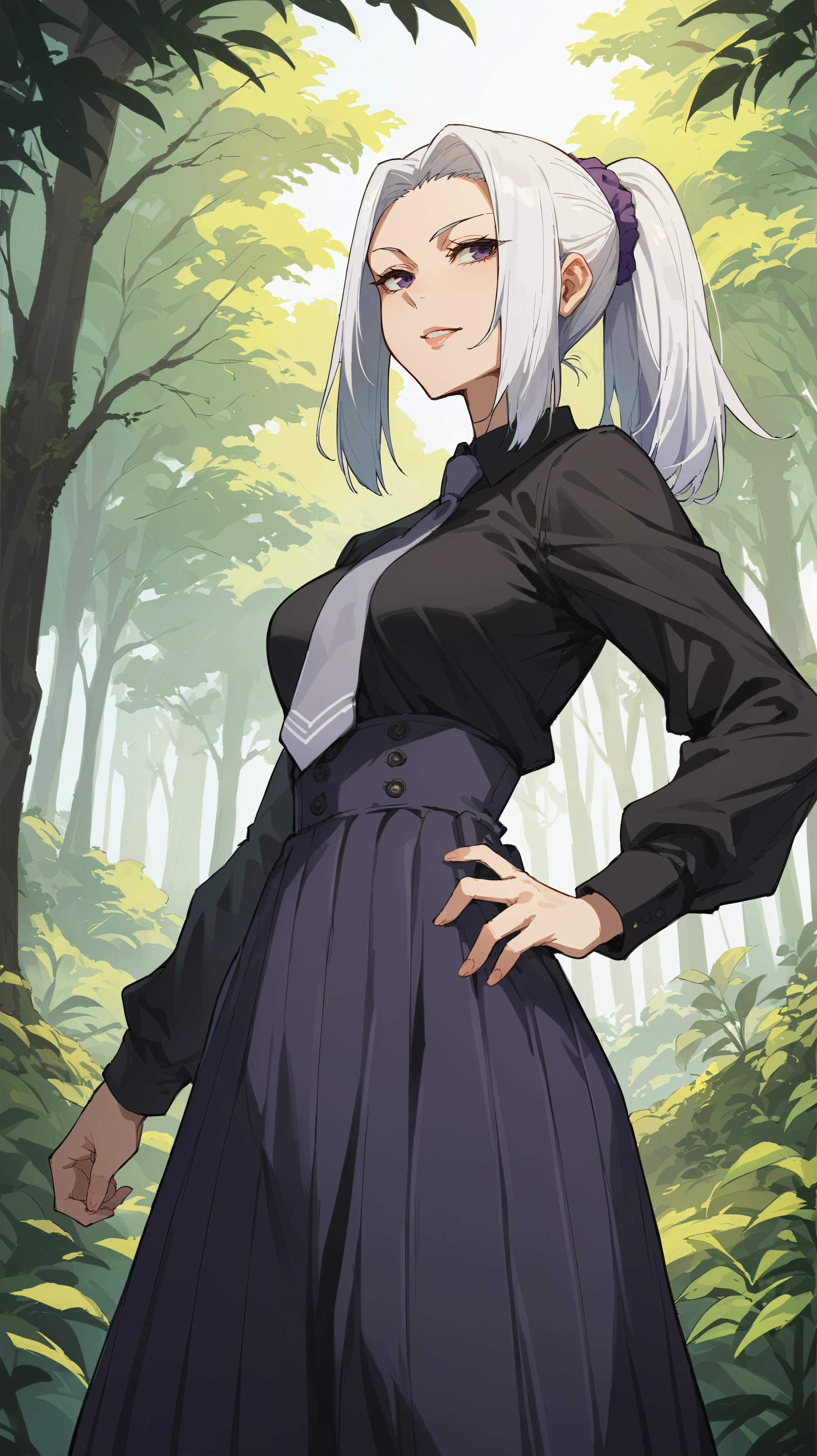 white hair, ponytail, parted bangs, hair ornament, scrunchie, purple eyes, black shirt, grey necktie, dark purple skirt, long skirt, high-waist skirt, bMeiDescription