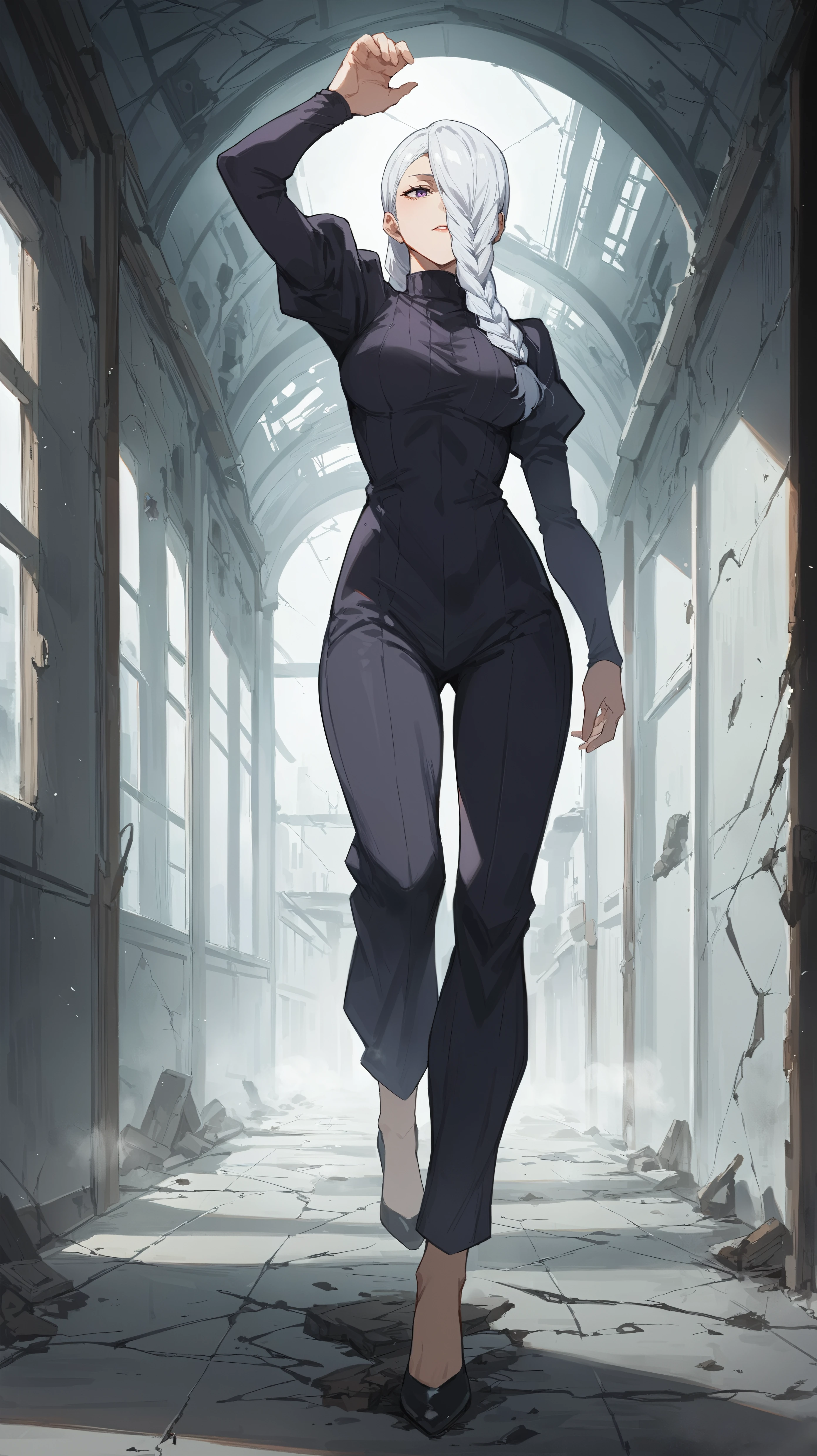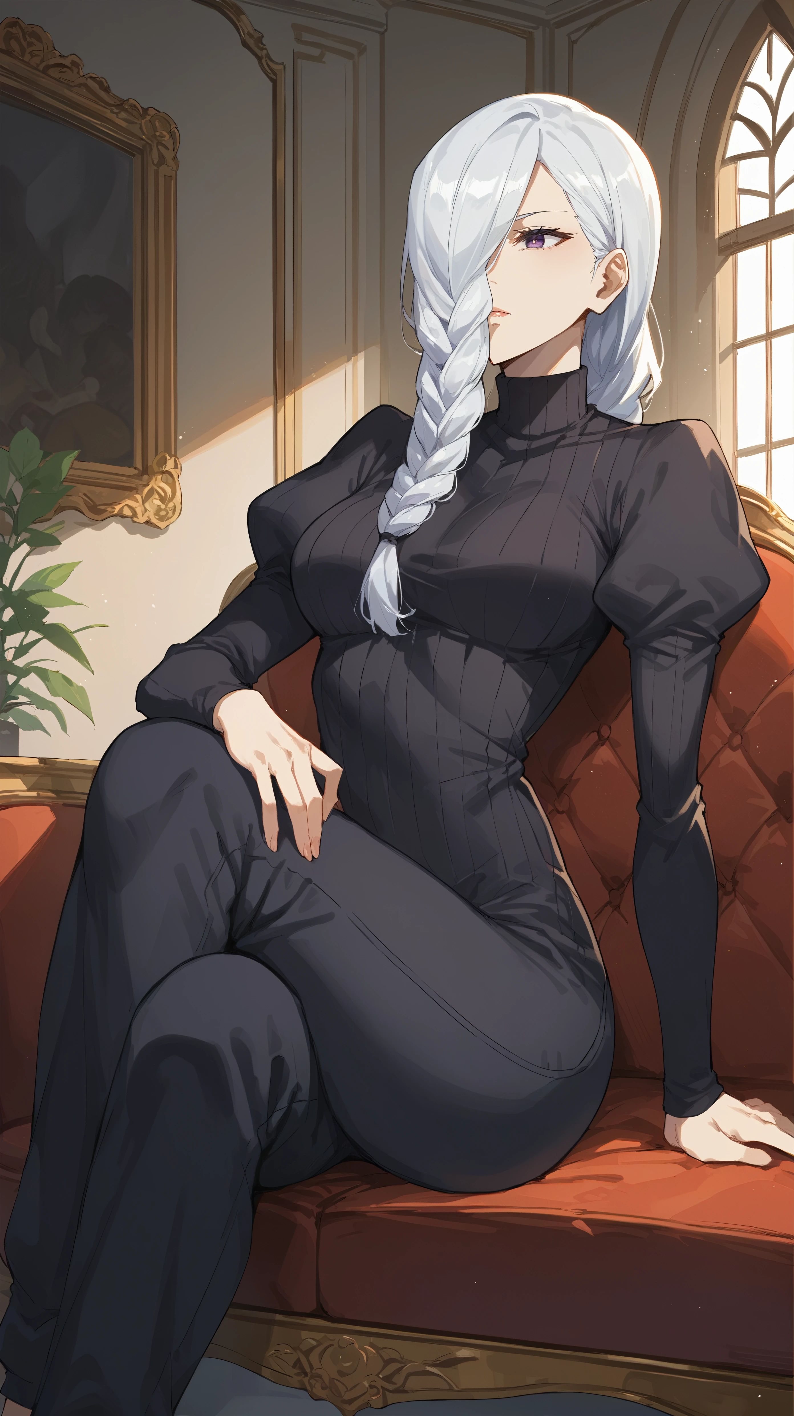 long hair, white hair, braid, hair over one eye, braided ponytail, purple eyes, black dress, long sleeves, puffy sleeves, turtleneck dress, wide leg jumpsuit pants, pants tucked in, aMeiYounger version:
