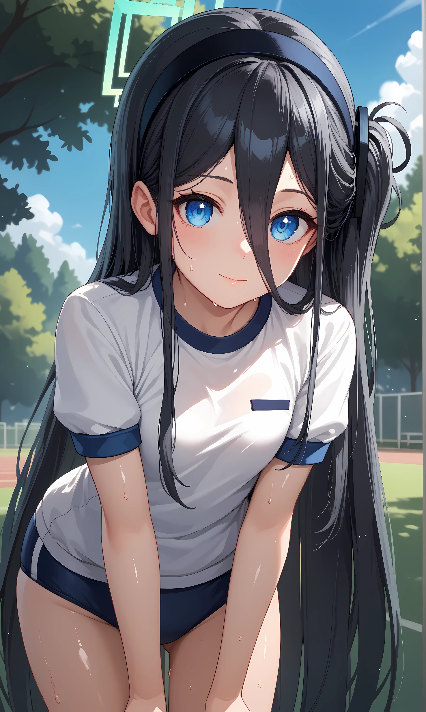 alice, blue eyes, black hair, absurdly long hair, hair between eyes, hairband, halo