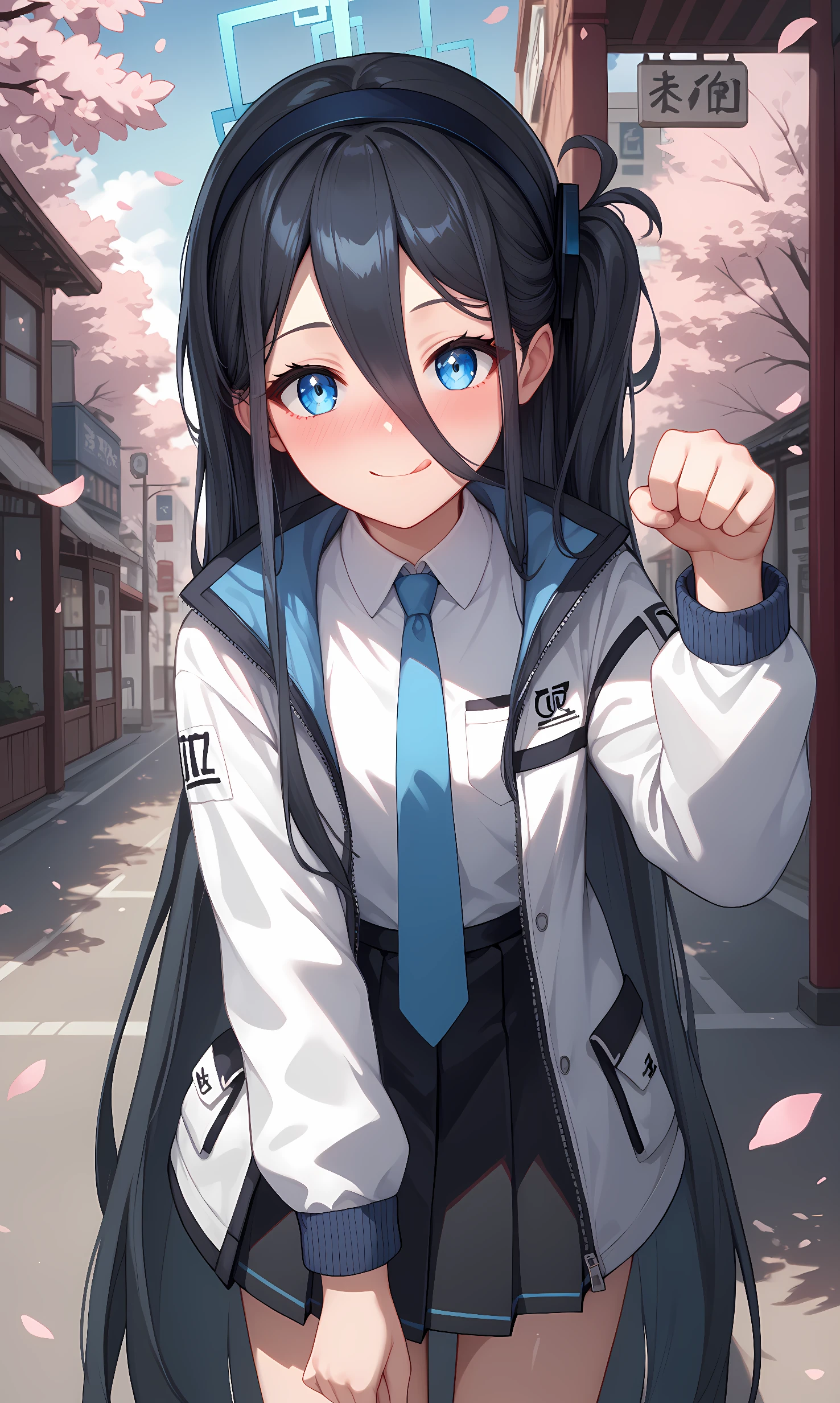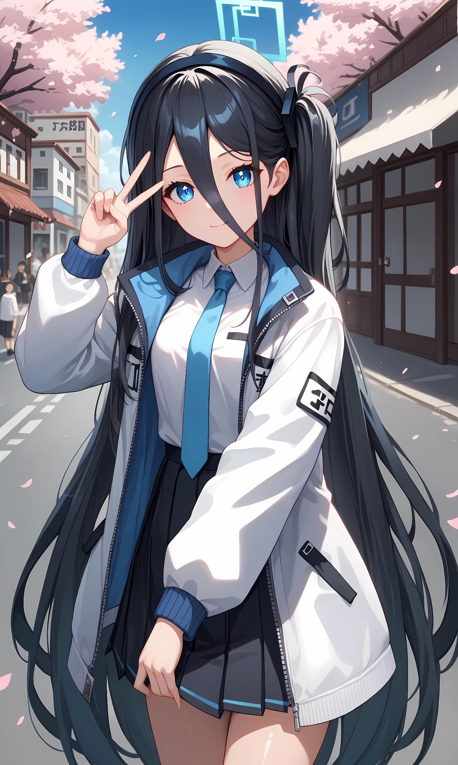 white jacket, long sleeves, open jacket, collared shirt, white shirt, blue necktie, black skirt, pleated skirt, black socks, white footwear