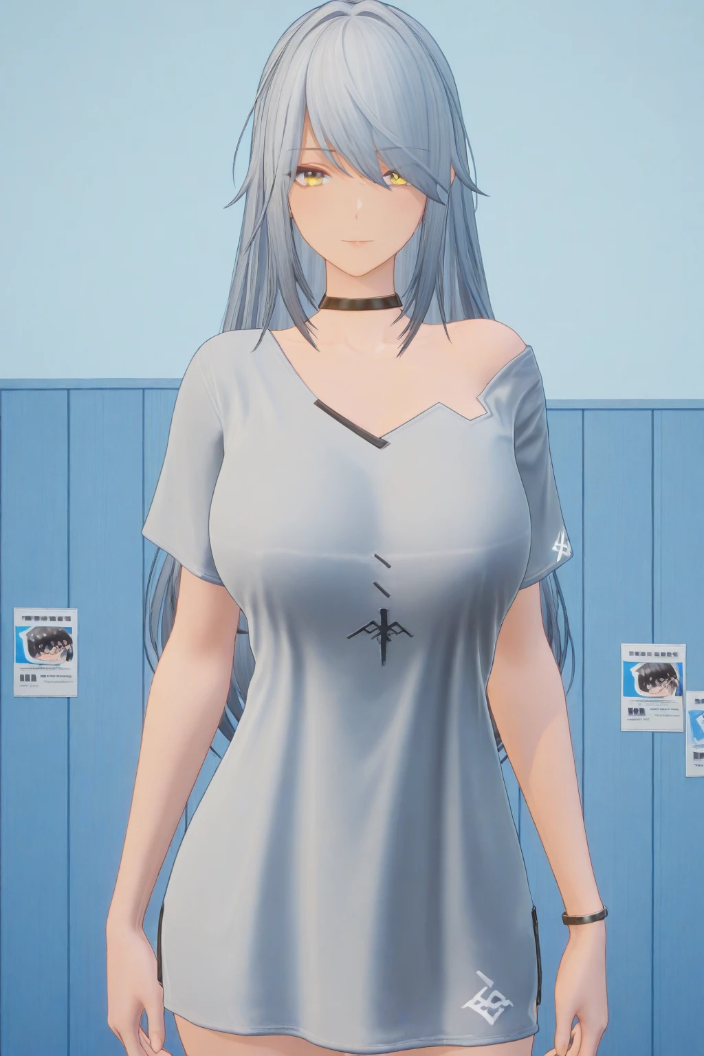 1girl, solo, adult, , yellow eyes, grey hair, long hair, side swept-bangs,long shirt, light blue, short sleeves, black choker