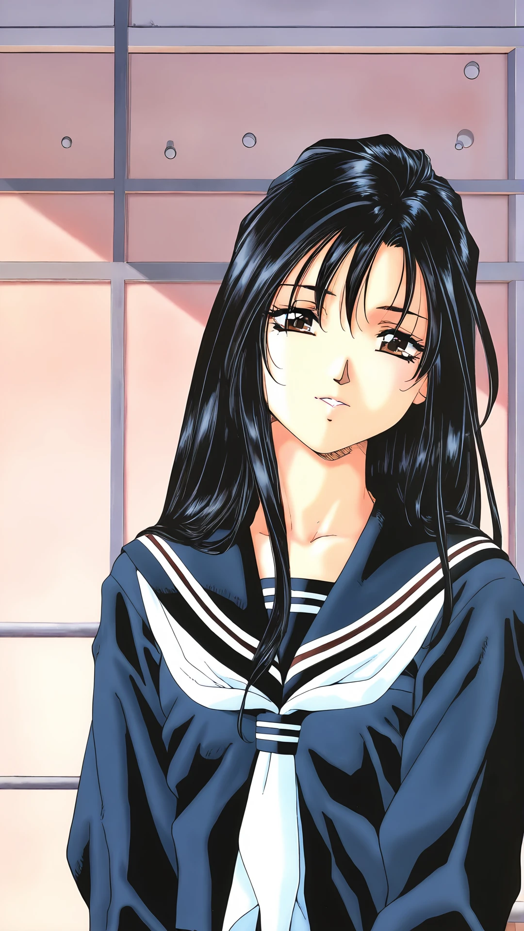 ,saigoparts,1girl,school uniform,long hair,serafuku,black hair,brown eyes,long sleeves,1990s \(style\),