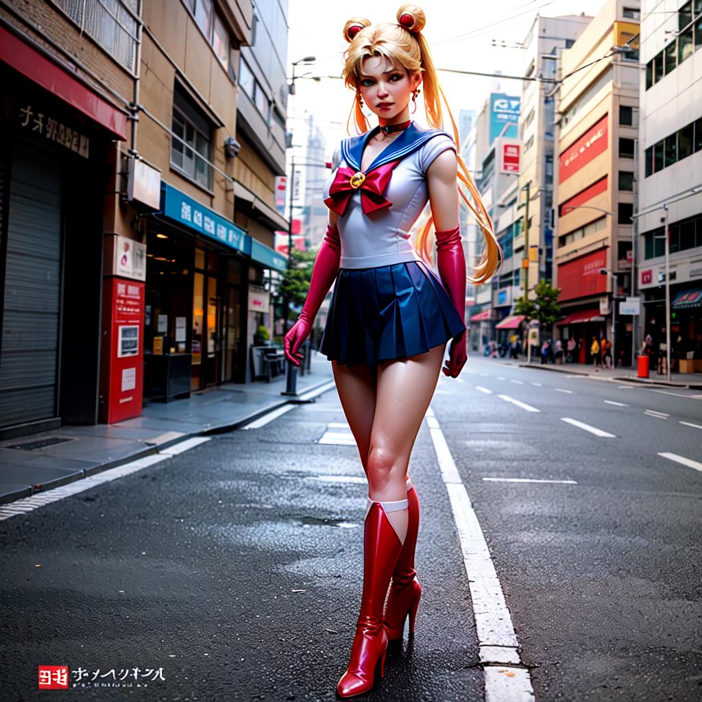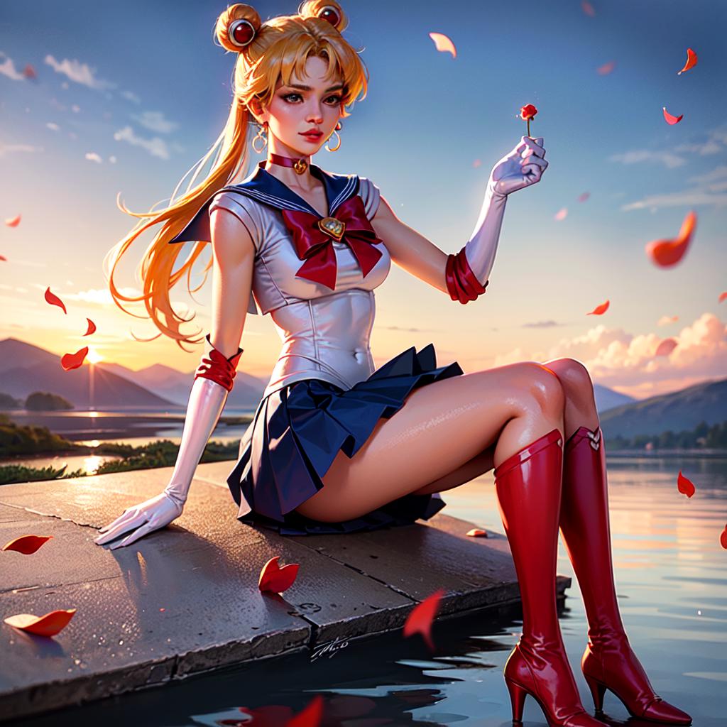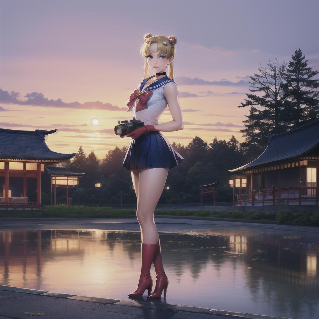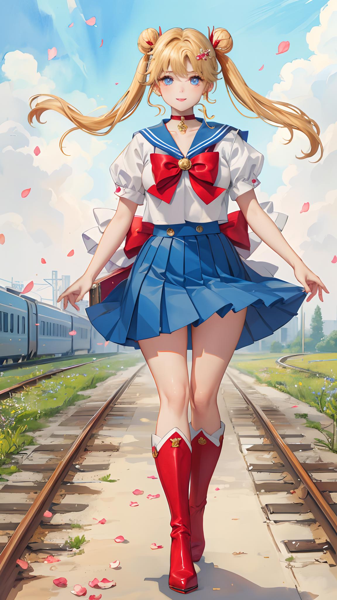 Sailor Moon, blonde hair, hair buns, twin tails, ornaments, hair ornaments, red ornaments, blue eyes, choker, red choker, choker on neck, top, white top, collar, sailor collar, blue sailor collar, collar on top, bow, red bow, bow on top, gloves, white gloves, long gloves, skirt, blue skirt, pleated skirt, boots, thigh boots, red boots