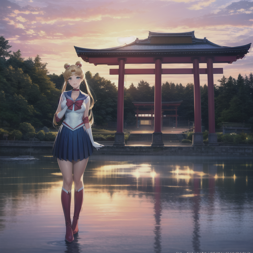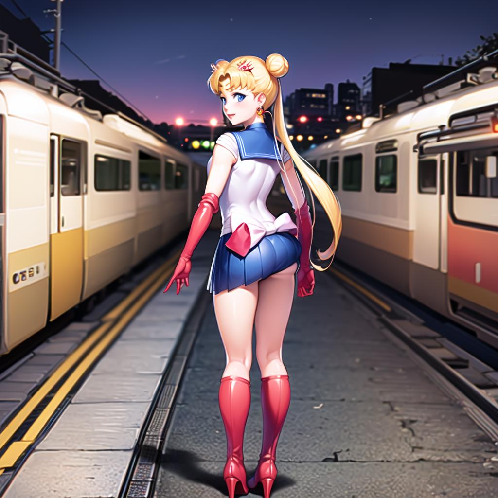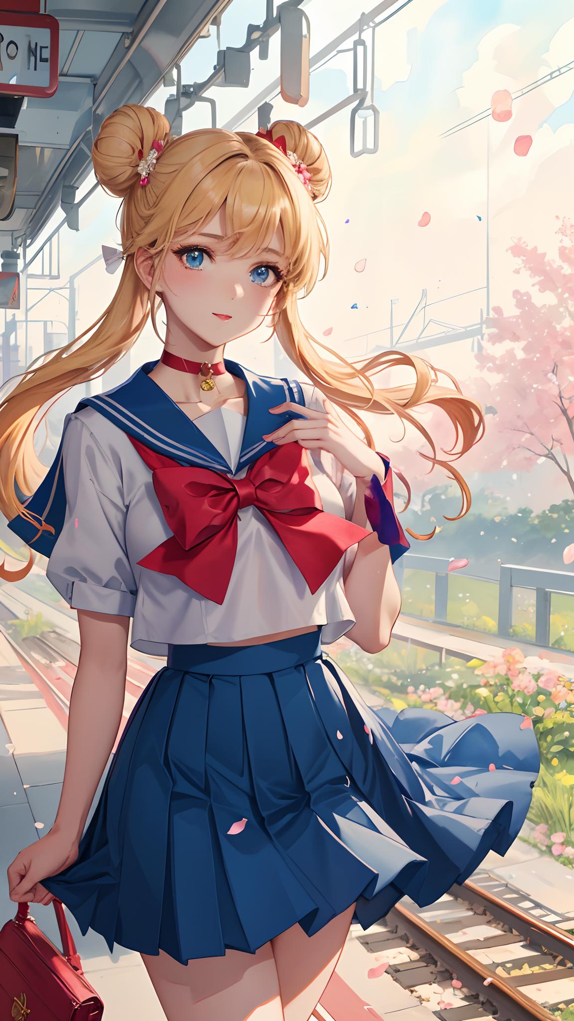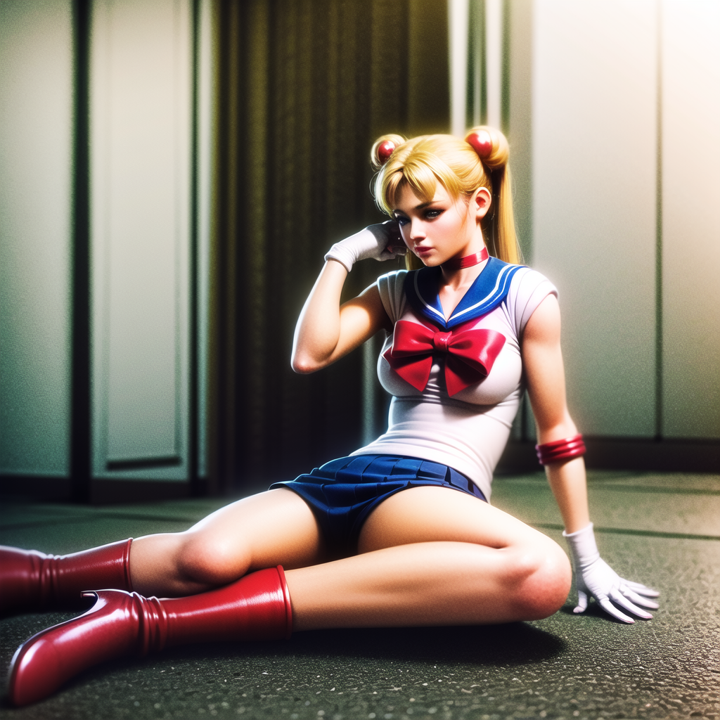 Sailor Moon, blonde hair, hair buns, twin tails, ornaments, hair ornaments, red ornaments, blue eyes, choker, red choker, choker on neck, top, white top, collar, sailor collar, blue sailor collar, collar on top, bow, red bow, bow on top, gloves, white gloves, long gloves, skirt, blue skirt, pleated skirt, boots, thigh boots, red boots