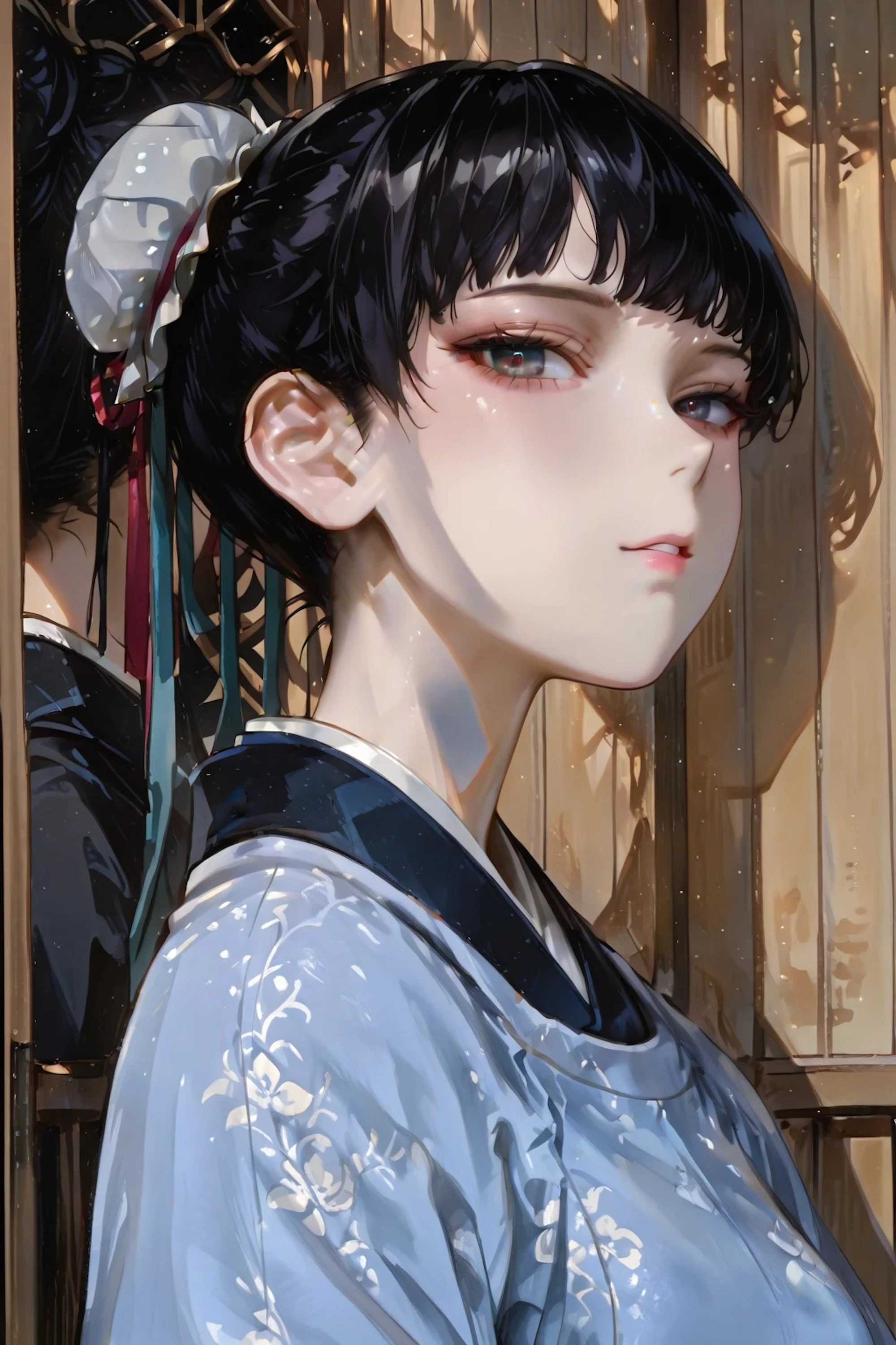 androgynous,female,fair skin,monolid grey eyes,black hair,black hairbun with with bun cover,black short bangs,chinese asian,slim fit body,medium-sized boobs,