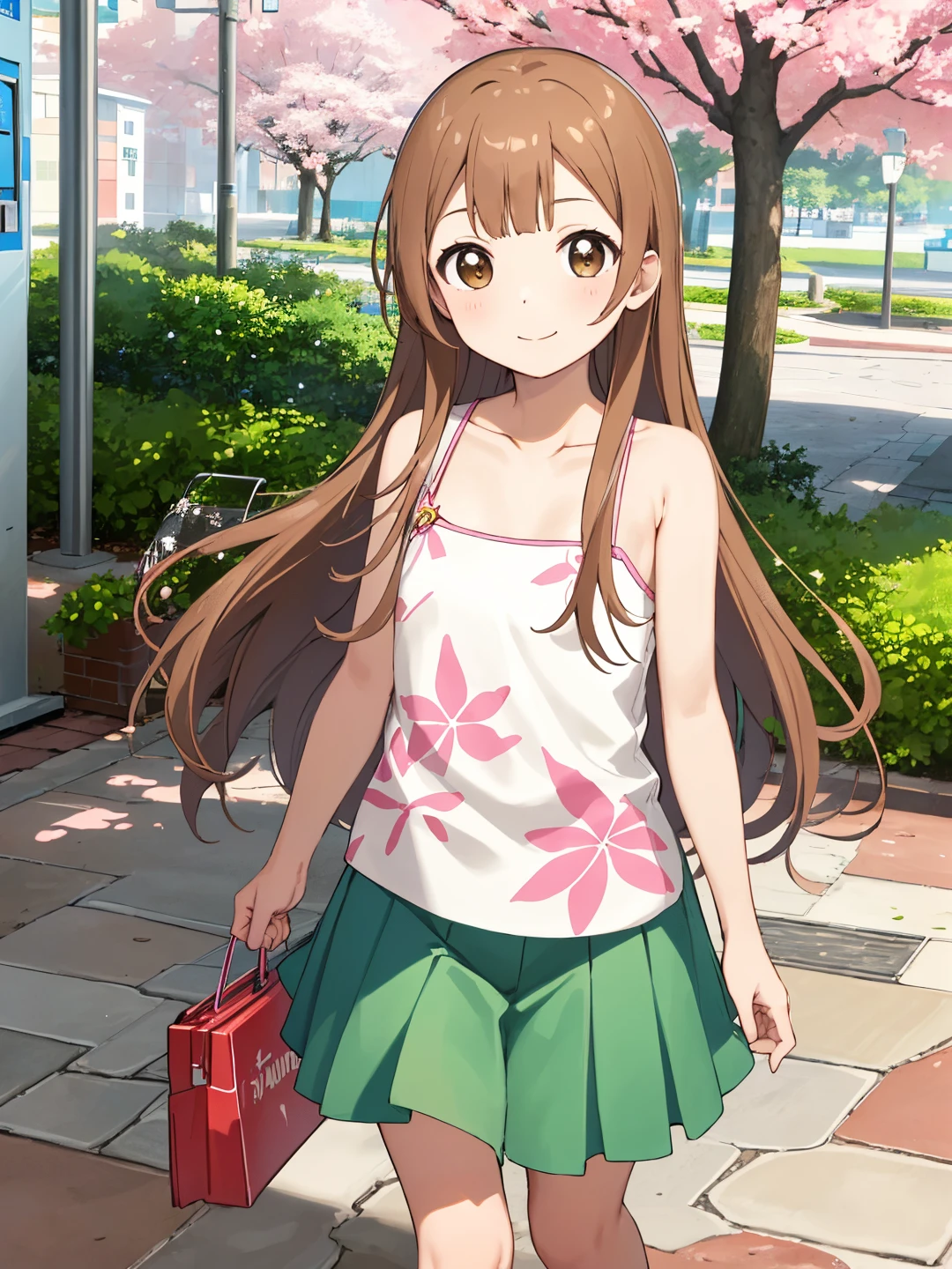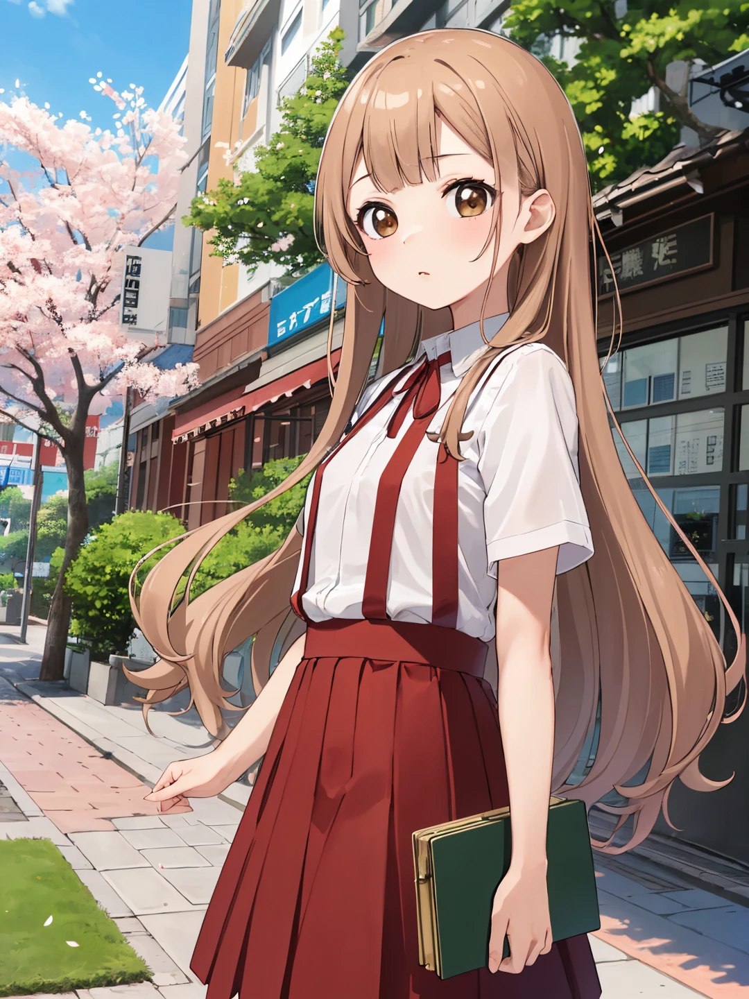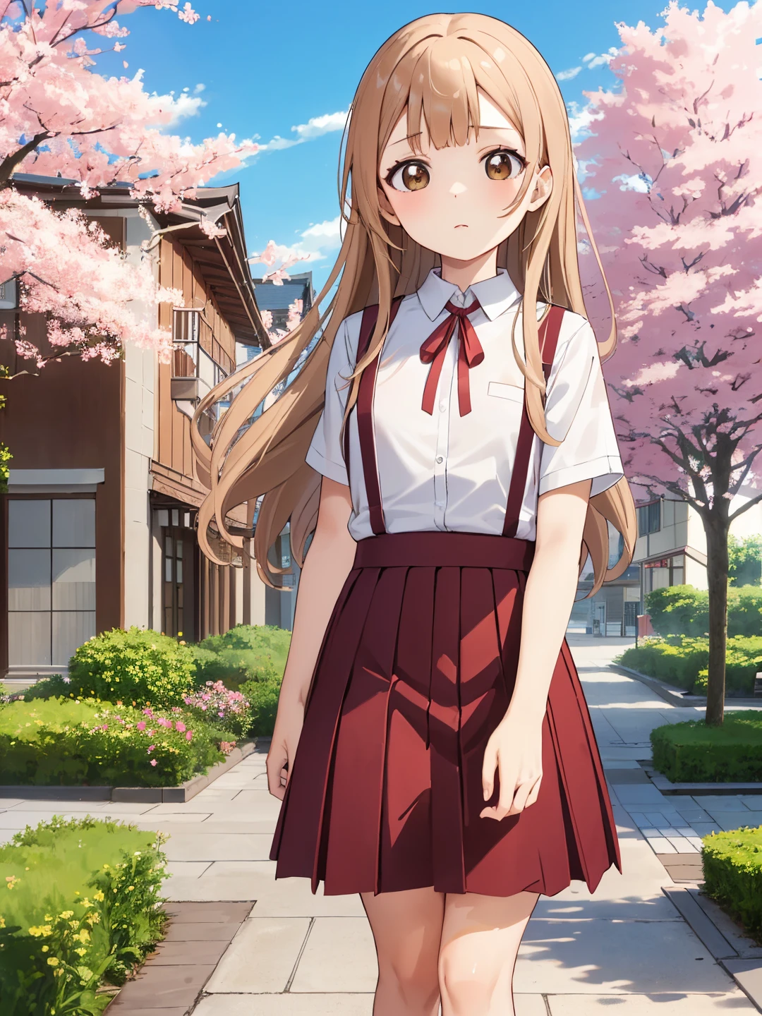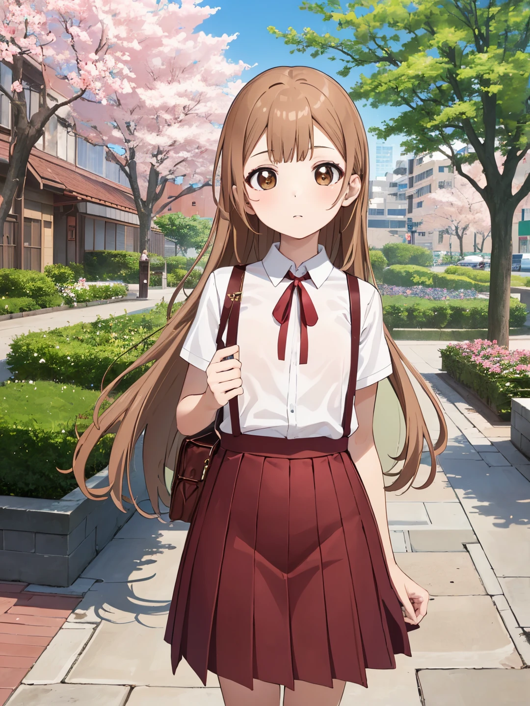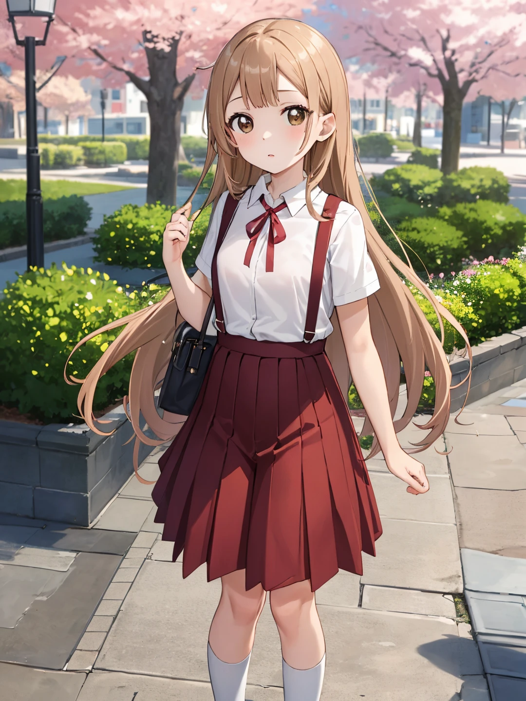 oomuro hanako, brown eyes, brown hair, very long hair school uniform, white shirt, red ribbon, (red skirt:1.2), suspenders, white legwear, loafers