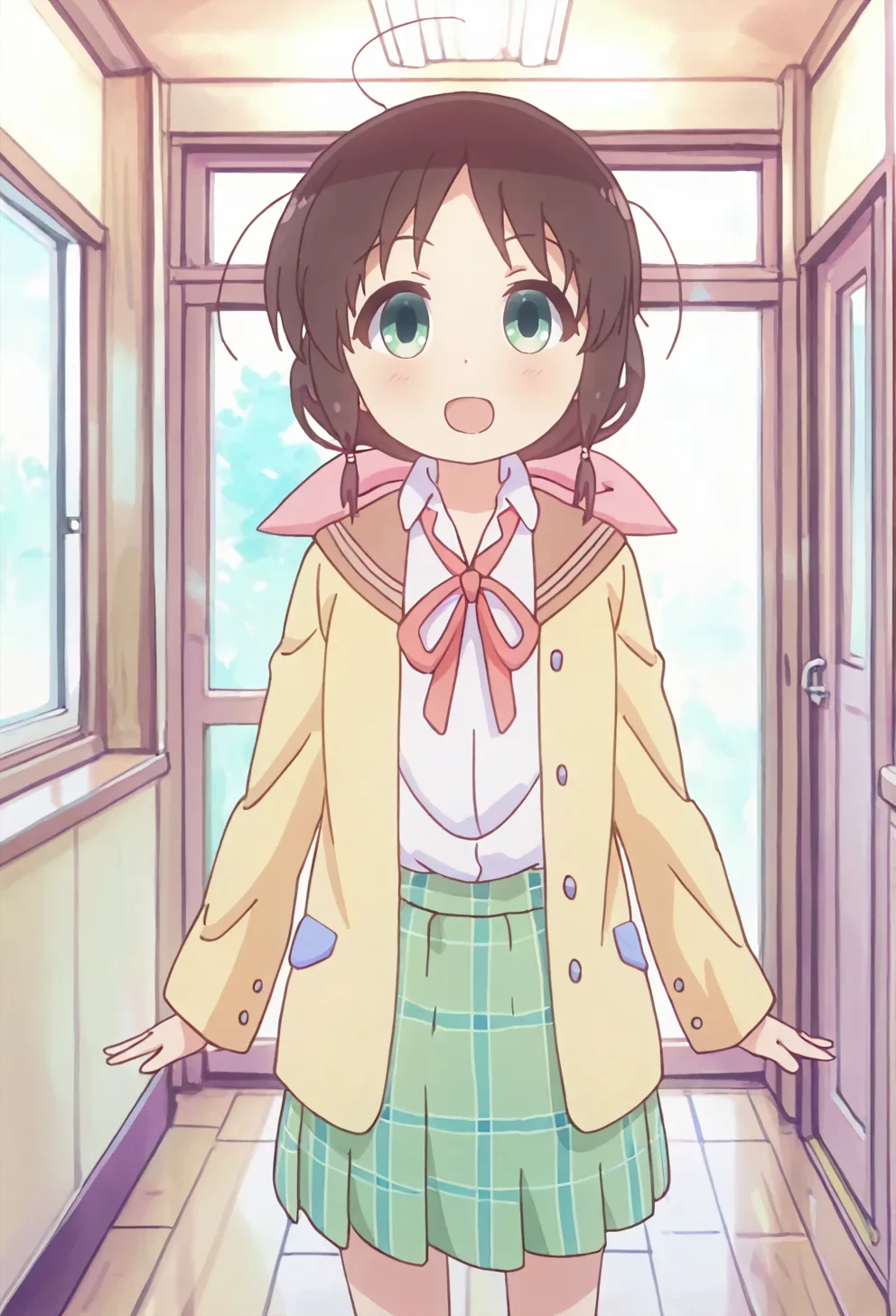 tamaki-default,honda tamaki, green eyes, brown hair,hair bow,low ponytail,school uniform, yellow jacket, brown sailor collar, green skirt,plaid skirt, white socks, loafers