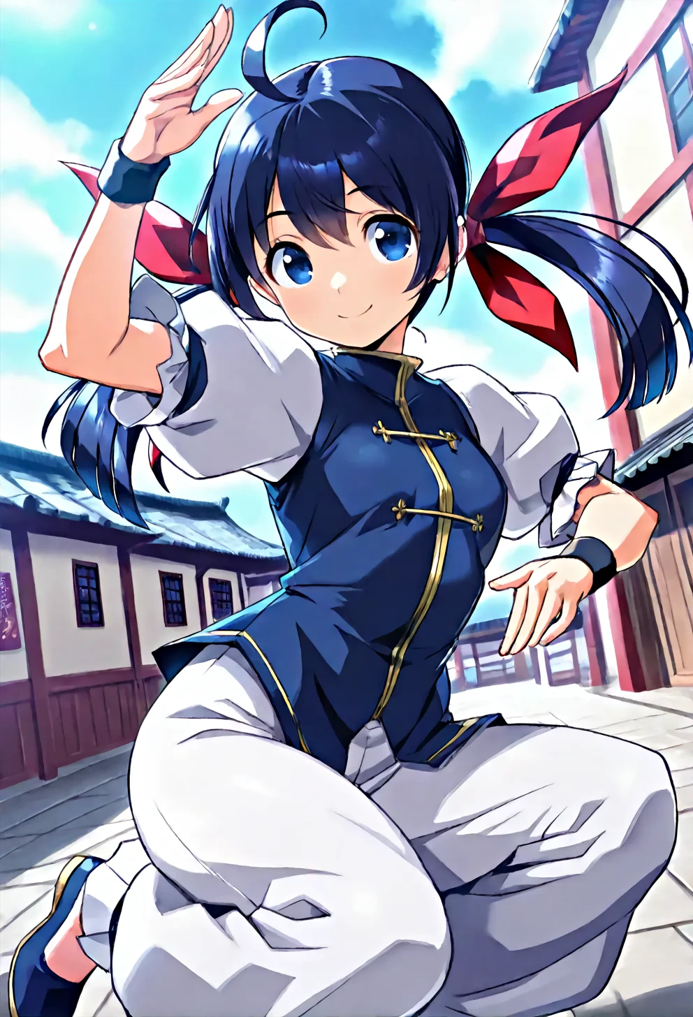 hotaru-default,futaba hotaru,blue eyes,blue hair,twintails,ahoge,hair ribbon,chinese clothes,blue vest,puffy short sleeves,wristband,white pants,blue footwear,