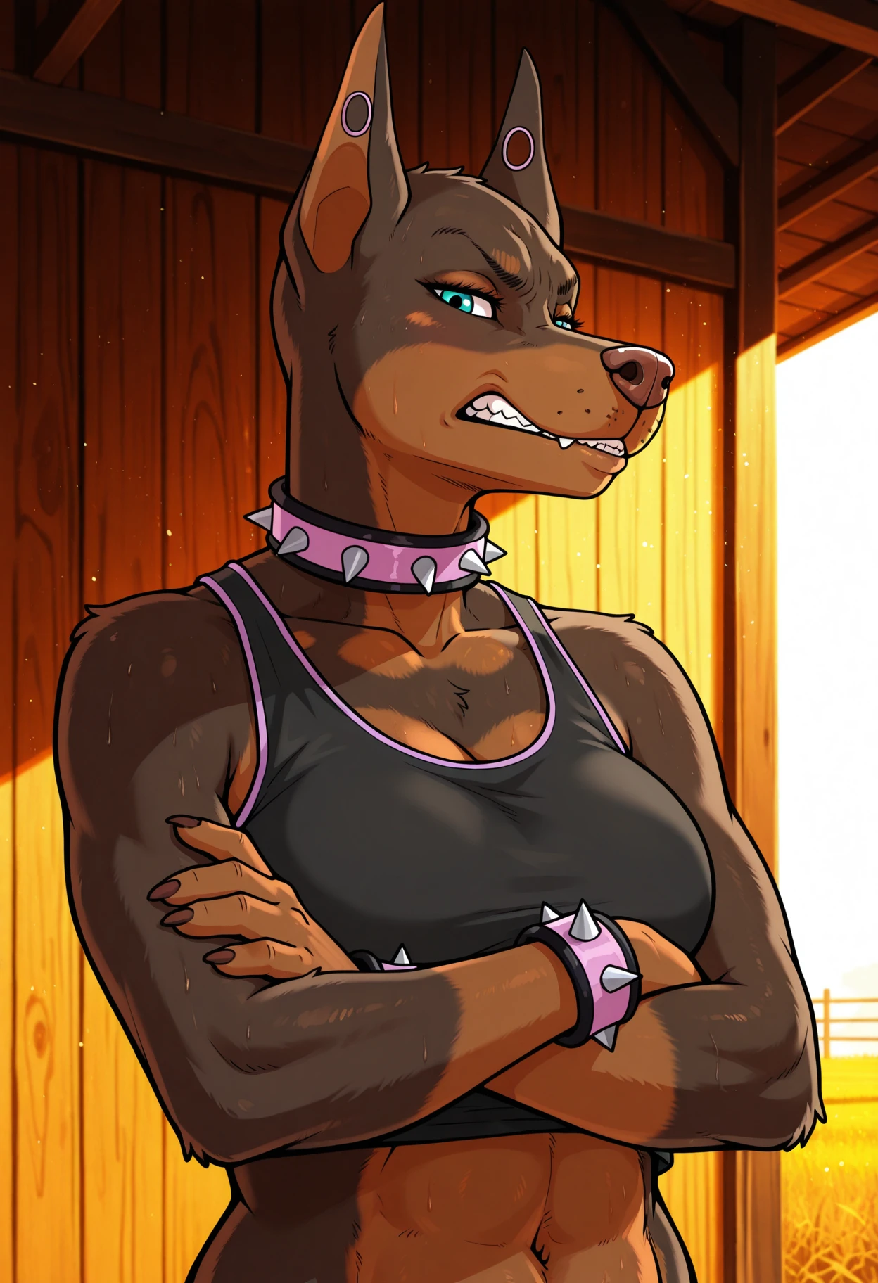 nikkiah, dobermann, dog girl, anthro, furry, furry female, gauged ear, aqua eyes, body fur, two tone fur, brown fur, spiked collar, spiked bracelet, tall female,