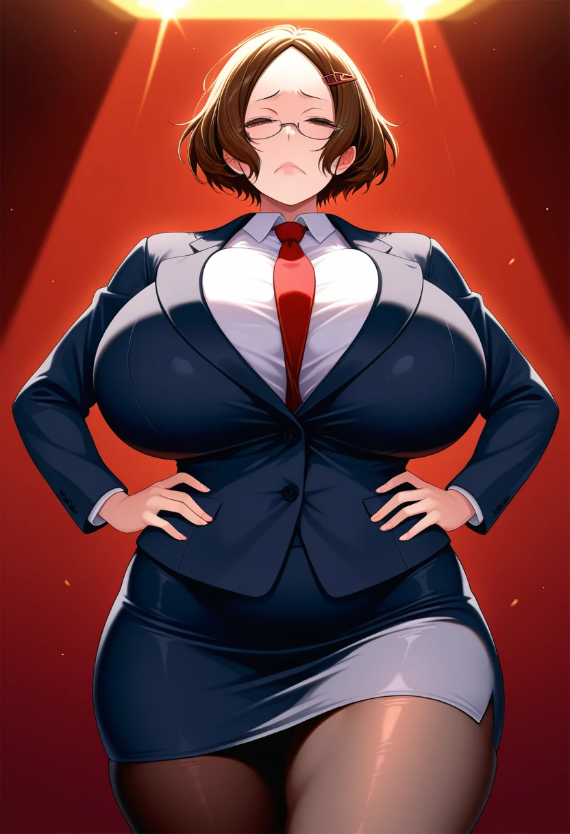 Omogamiww, mature female, black eyes, black hair, short hair, messy hair, parted bangs, forehead, hair ornament, hairclip, half-closed eyes, glasses, huge breasts, plump, wide hips, thick thighs, lips,