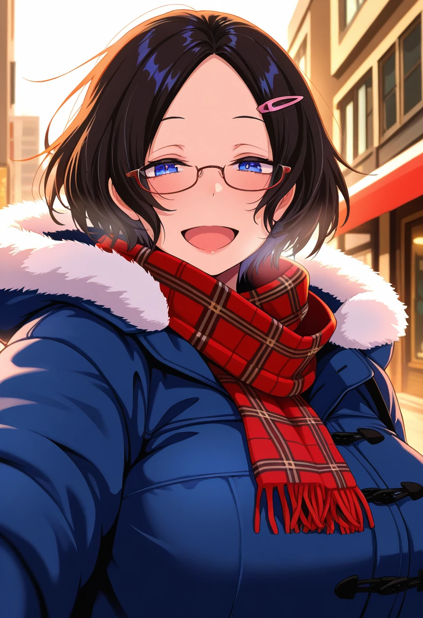 omogamiww, mature female, plump, short hair, parted bangs, hairclip, glasses, huge breasts,