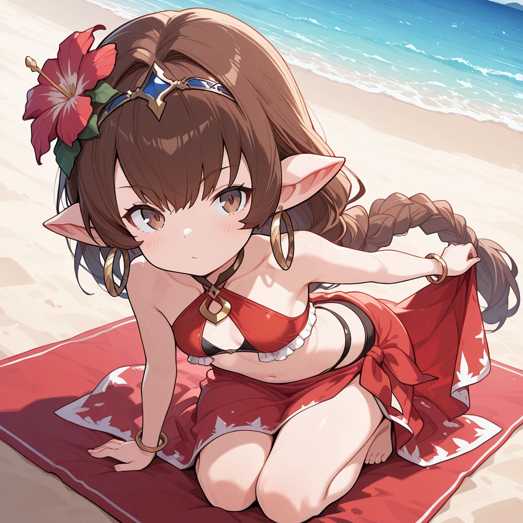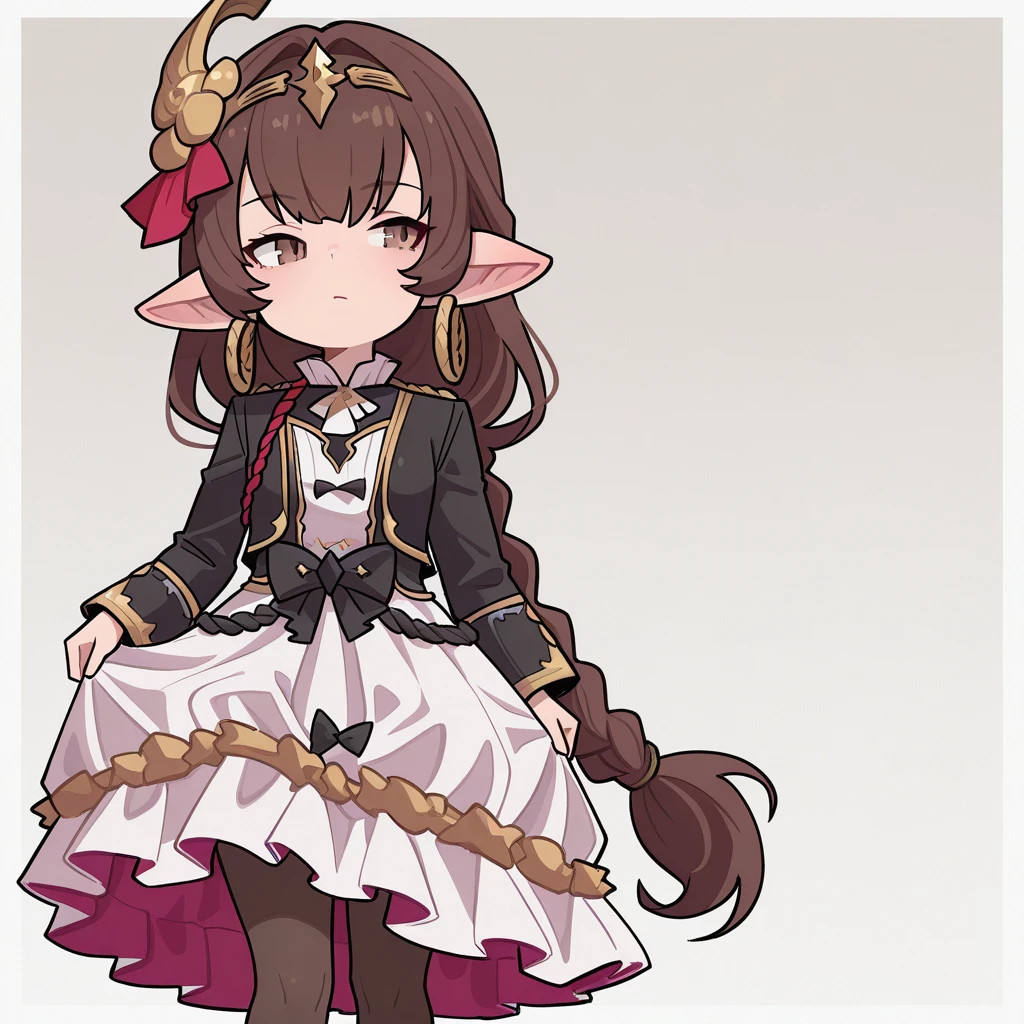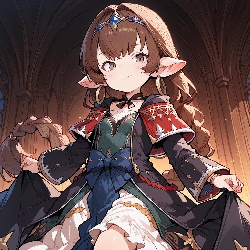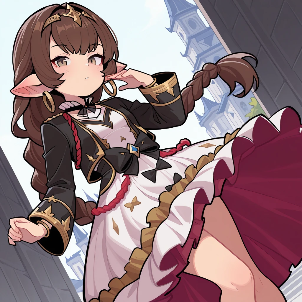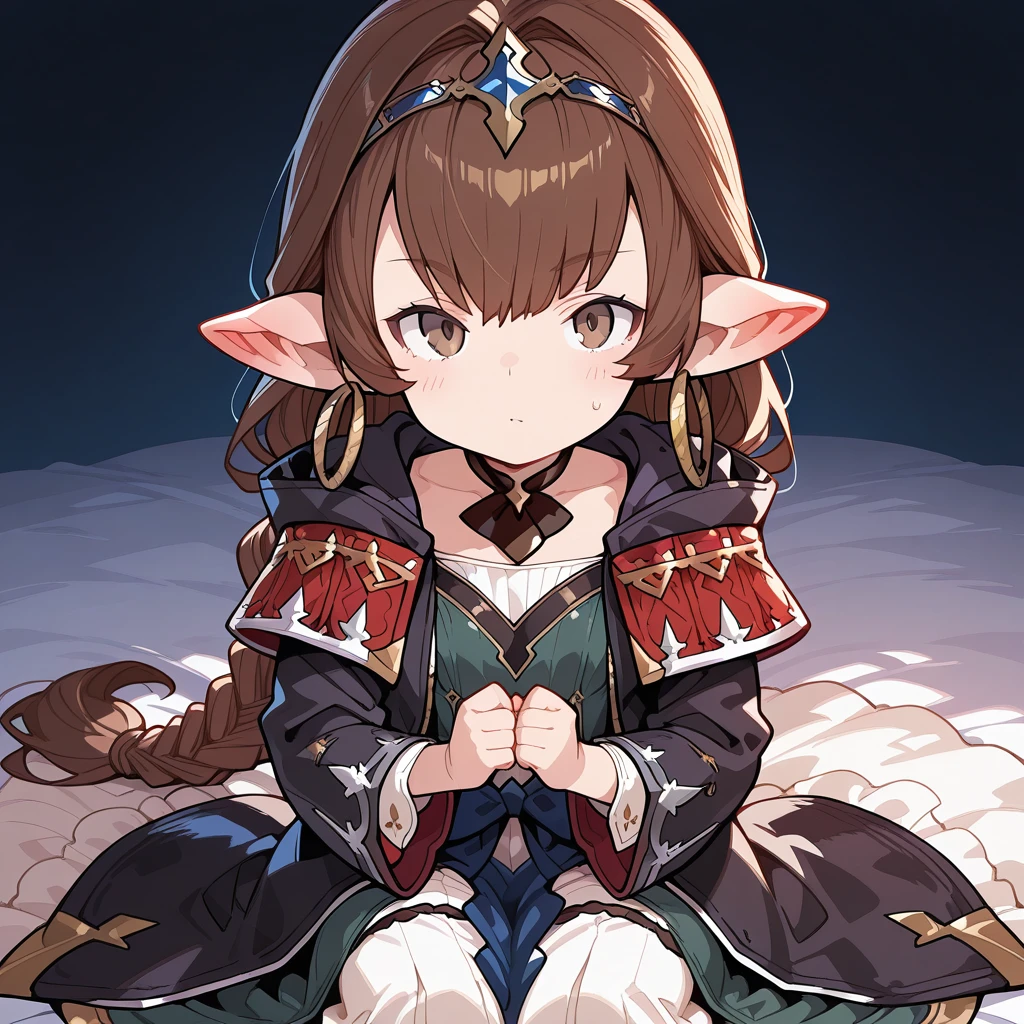 1girl, brown hair, single braid, long braid, brown eyes, pointy ears, harvin, hair between eyes, hoop earrings, small breasts, petite,