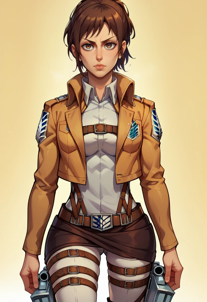 Character prompt: SashabrausSDXL, 1girl, solo, looking at viewer, short hair, brown hair, jacket, ponytail, boots, belt, pants, uniform, thigh strap, knee boots, emblem, paradis military uniform, three-dimensional maneuver gear, survey corps (emblem), training corps (emblem), wide hips,