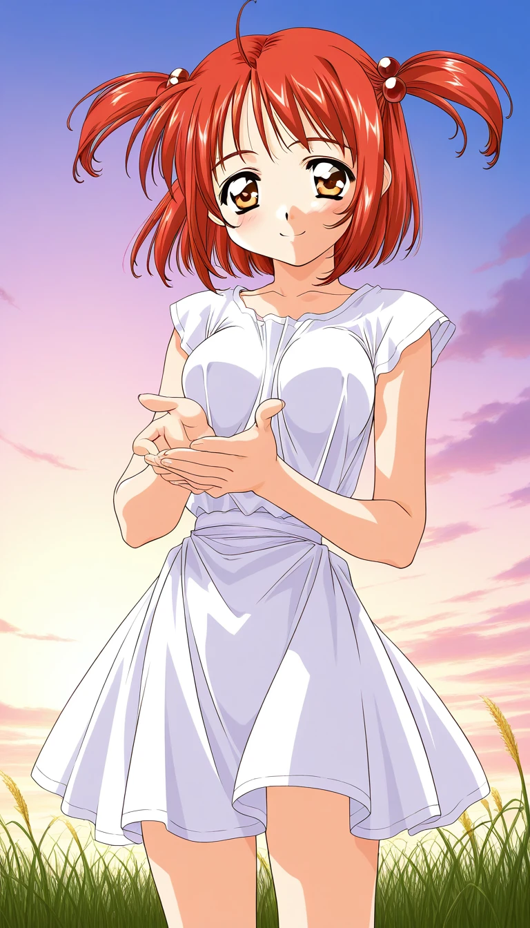 Normal_Megumi, 1girl, red hair, short hair, hair bobbles, brown eyes, medium breasts, twintails, two side up, hair ornament,