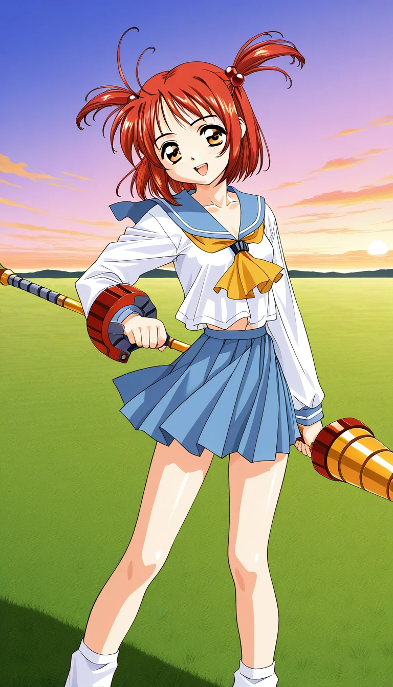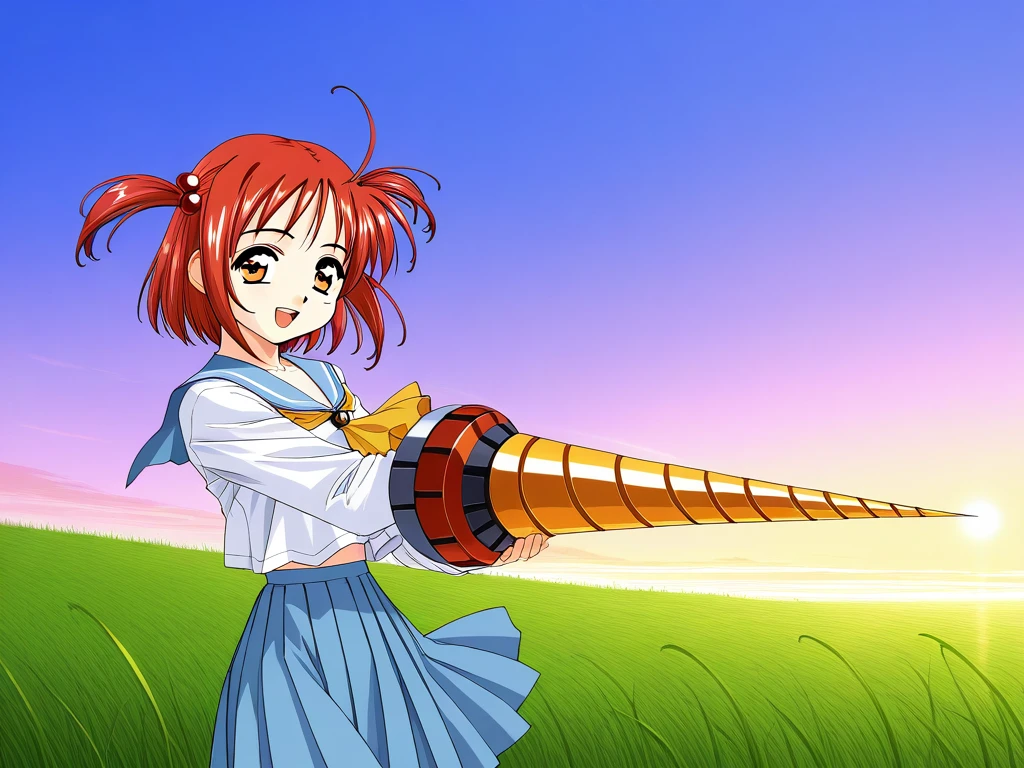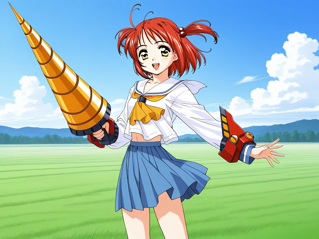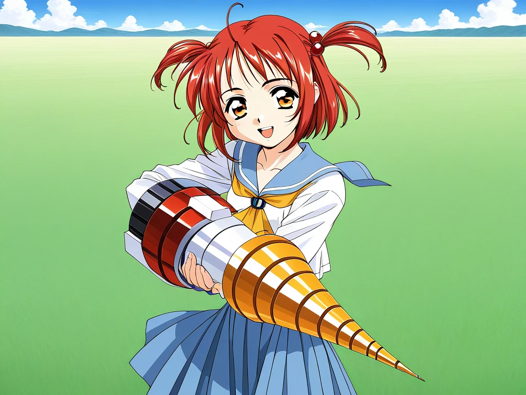Drill_Megumi, 1girl, drill, weapon, red hair, short hair, brown eyes, hair bobbles, hair ornament, two side up,