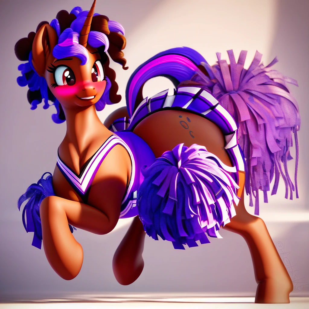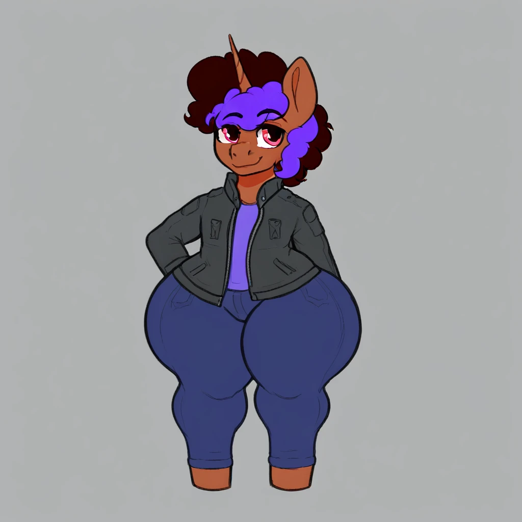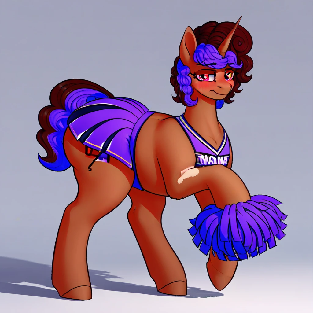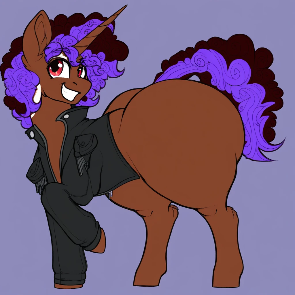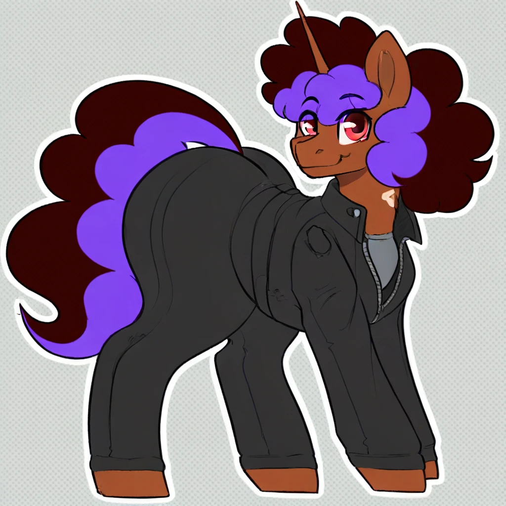 Caramel Mirage (OC),Brown Skin, Fluffy mane, Unicorn, brown mane with violet stripe, red eyes,male