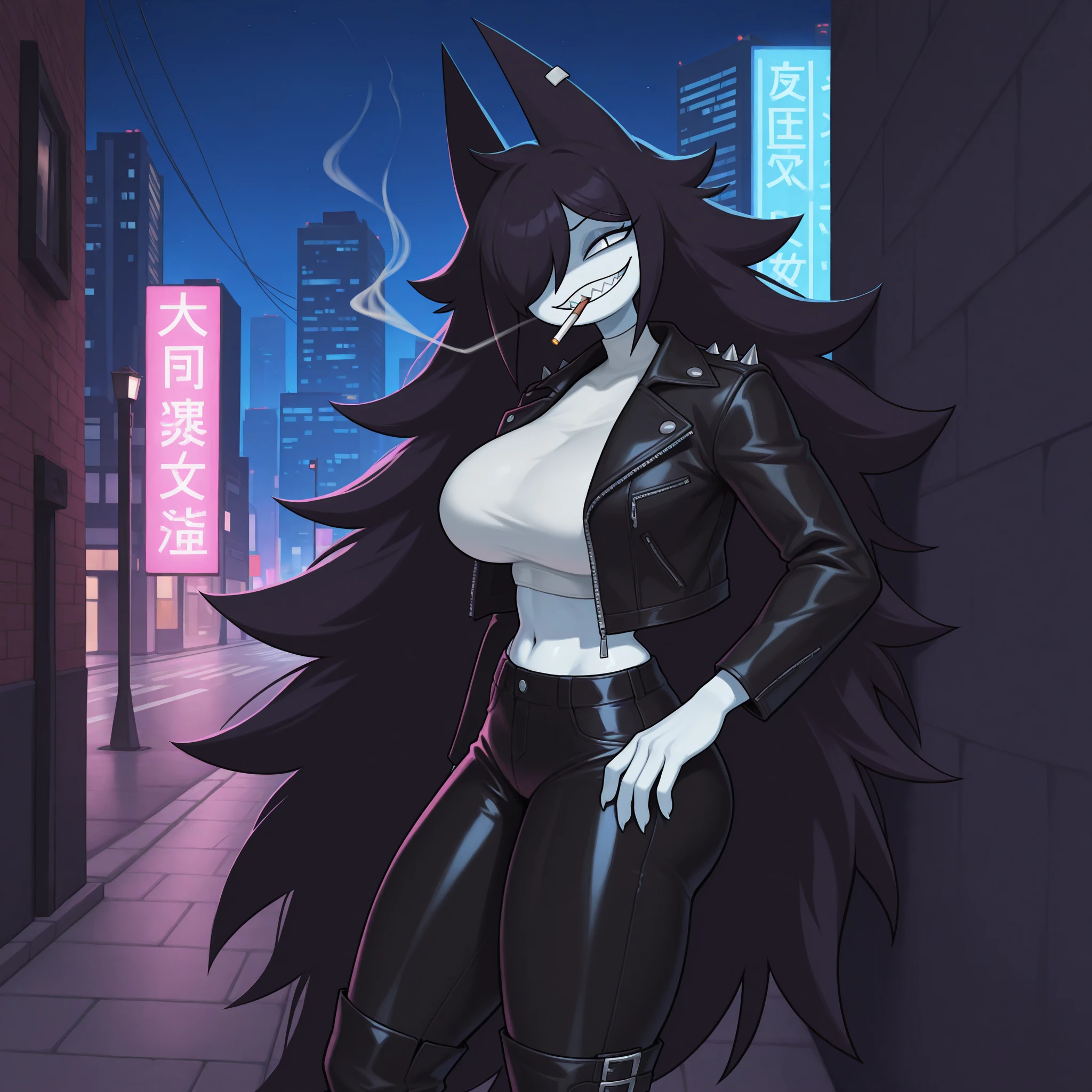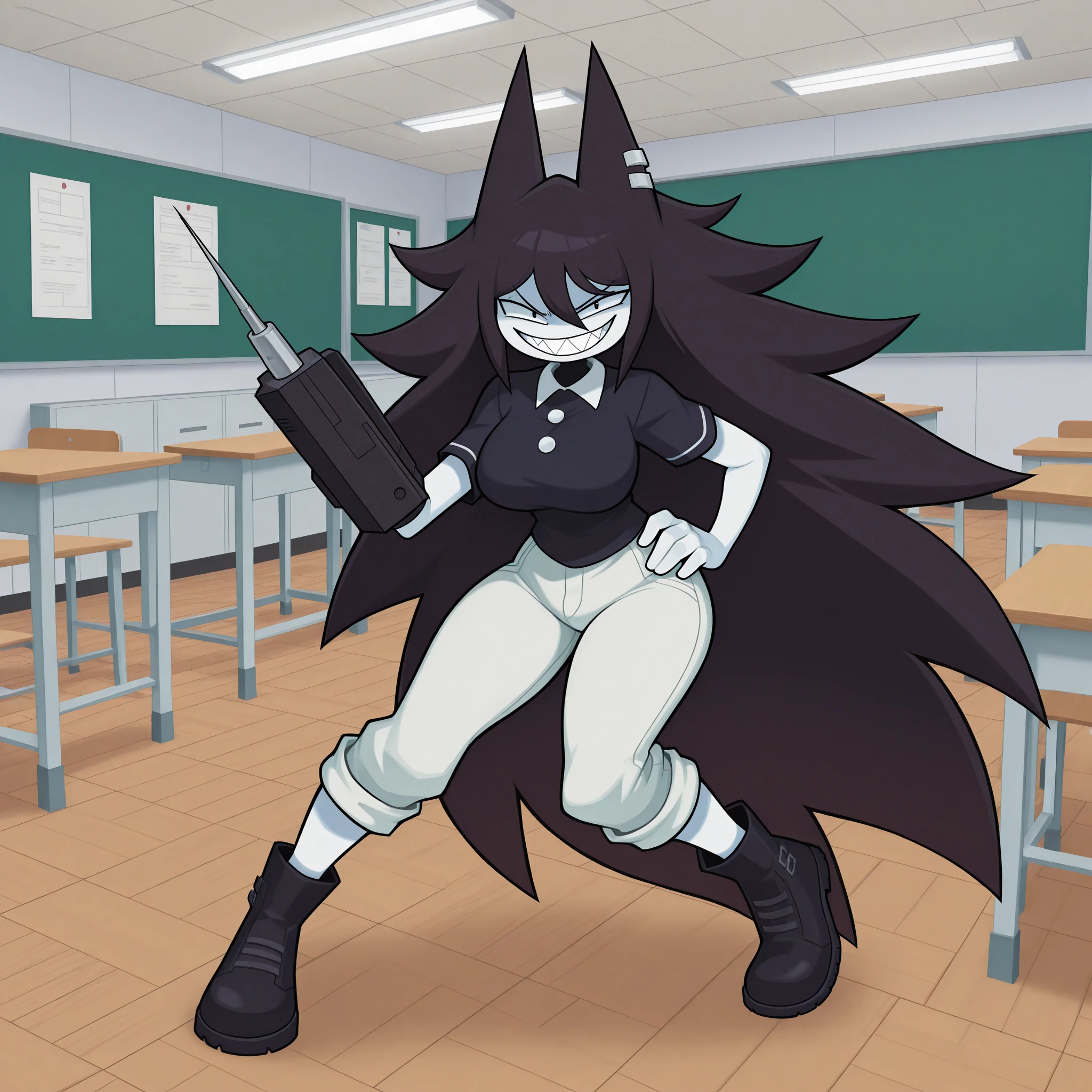Core: mcfpe, miss circle (fundamental paper education), white skin, black hair, spiked hair, very long hair, hair between eyes, blank eyes, slit pupils, no nose, white earclip, collared shirt, two-tone shirt, white shirt, black shirt, short sleeves, white cargo pants, pants rolled up, black combat boots, tall female