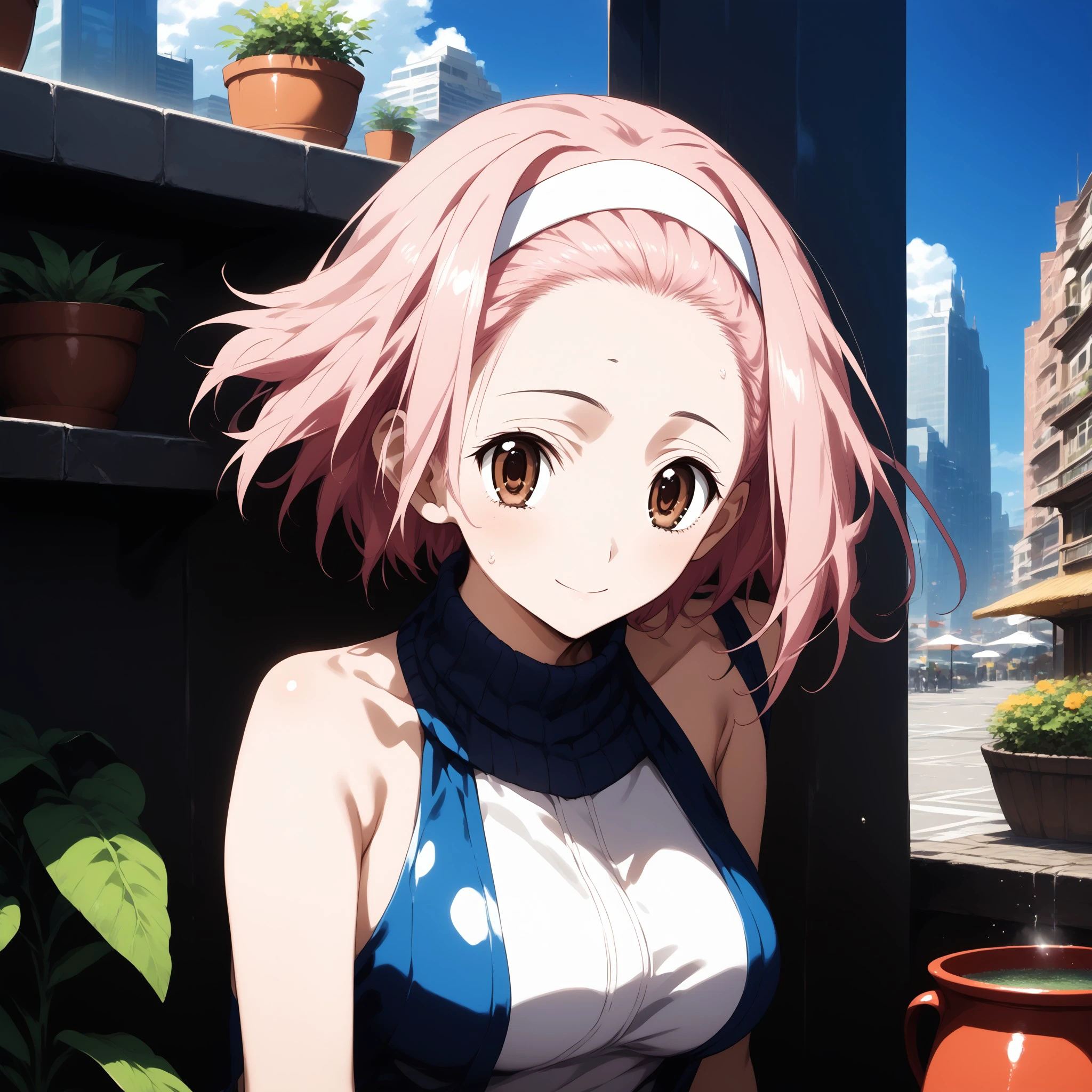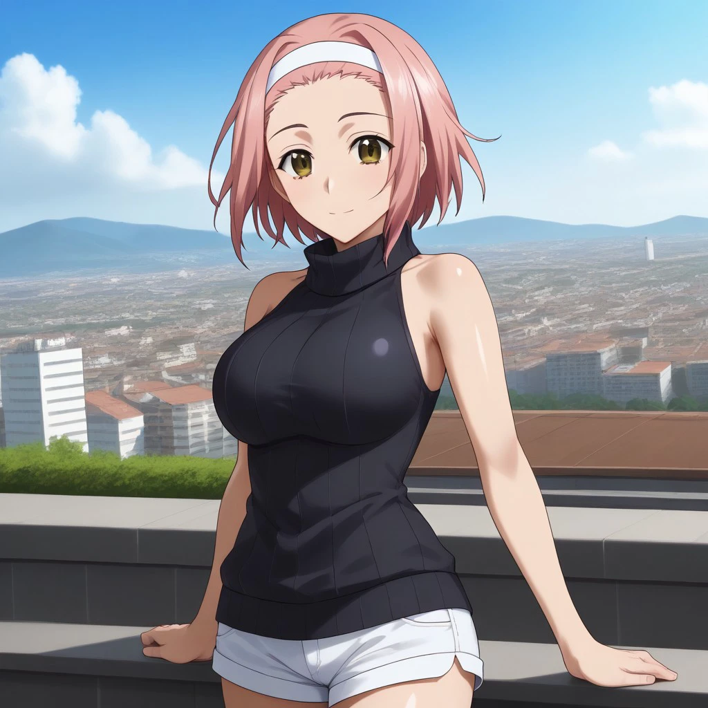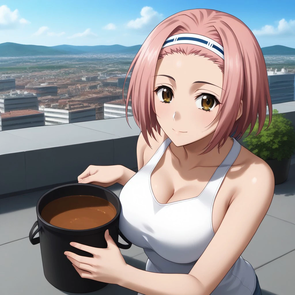 1girl, Katase, headband White, Pink hair, Short hair, Medium boobs, Brown eyes, wide wips