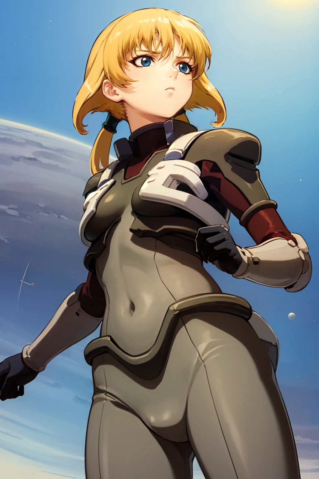 "low twintails" is a bit of a double edged sword. In most of the frontal shots they're actually hidden by the suit's collar, and adding it to the prompt may make them too noticeable/long.