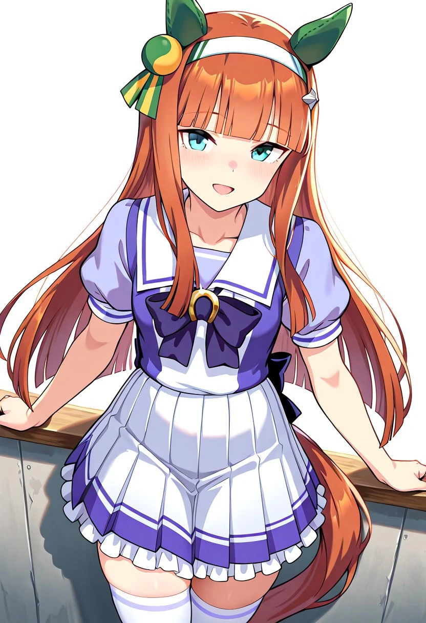 tracen school uniform, sailor collar, purple bow, purple bowtie, purple shirt, puffy short sleeves, sailor shirt, white skirt, pleated skirt, miniskirt, white thighhighs, brown footwear, shoes, horseshoe ornament, serafuku, zettai ryouiki, frilled skirt, frills