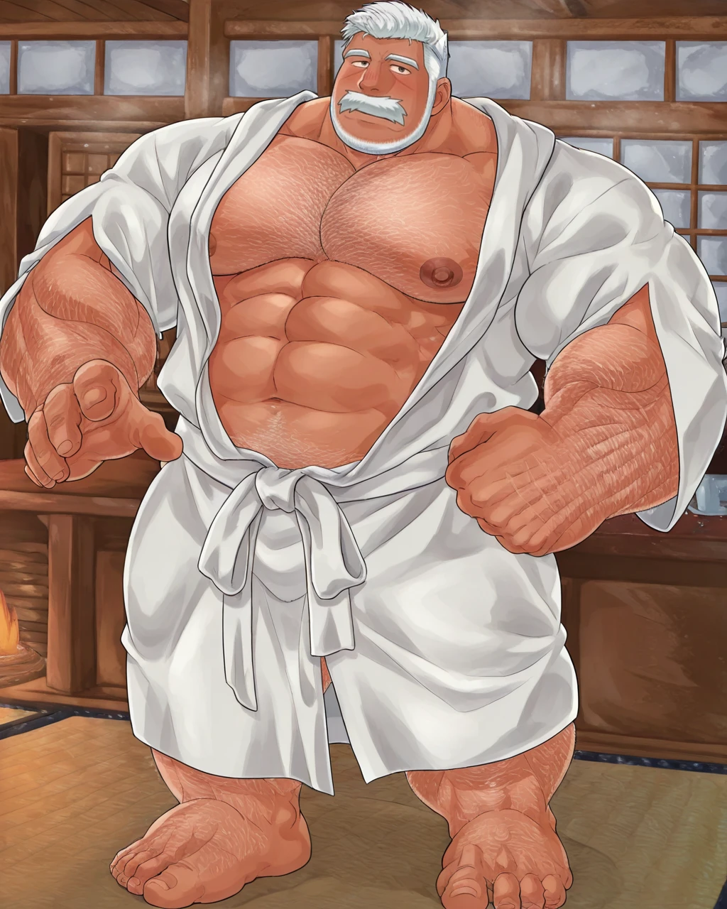 FLT,male focus,nipples,facial hair,bara,old man,mature male,large pectorals,muscular male,old,muscular,short hair,chest hair,pectorals,white hair,mustache,arm hair,abs,blush,hairy,sideburns,beard,navel hair,