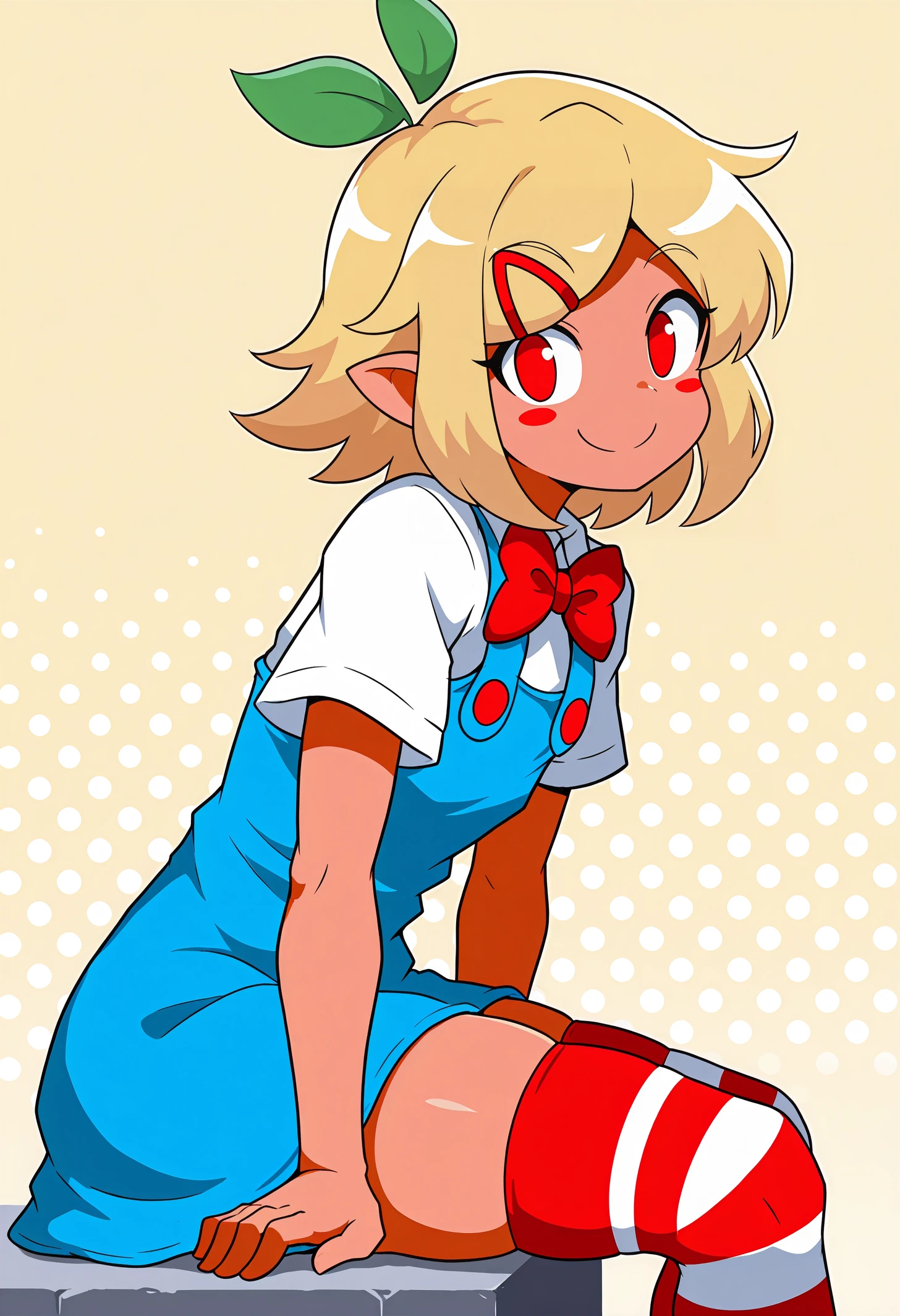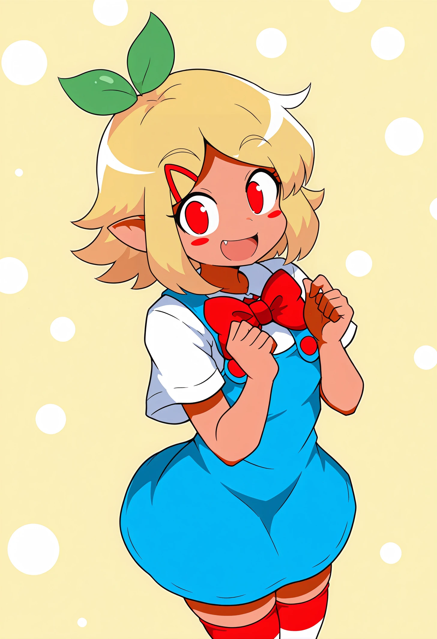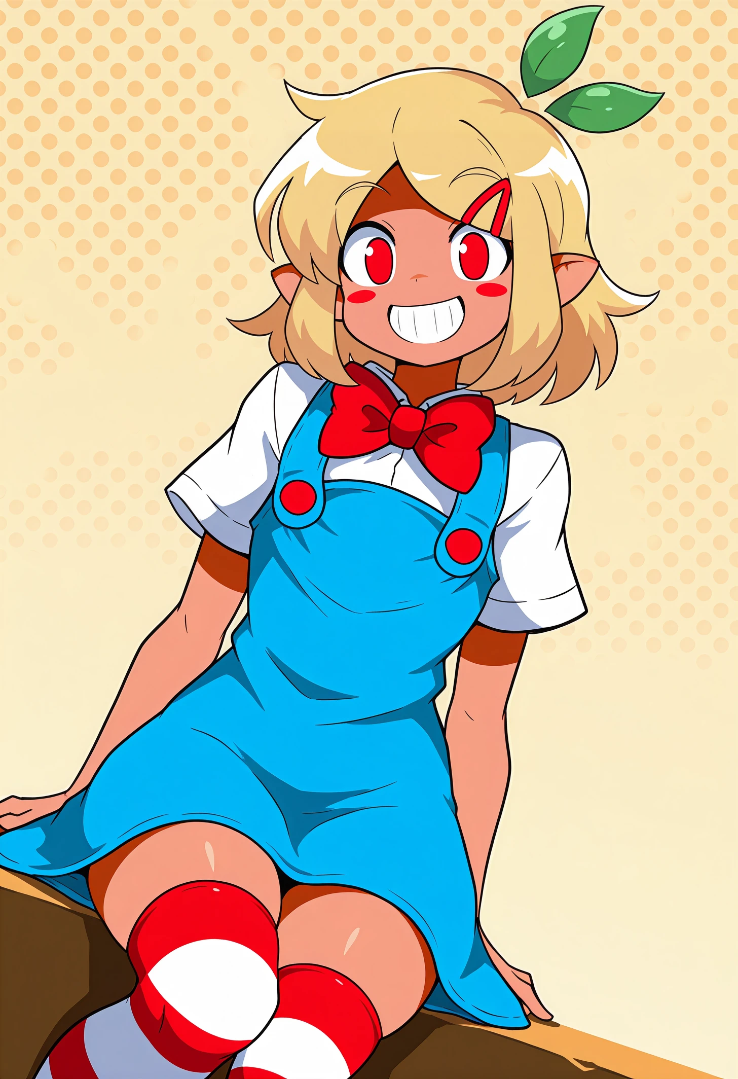 pztwpzhd, tan, short hair, blonde hair, hair ornament, medium hair, sidelocks, leaf, red eyes, pointy ears, blush stickers, hairclip,