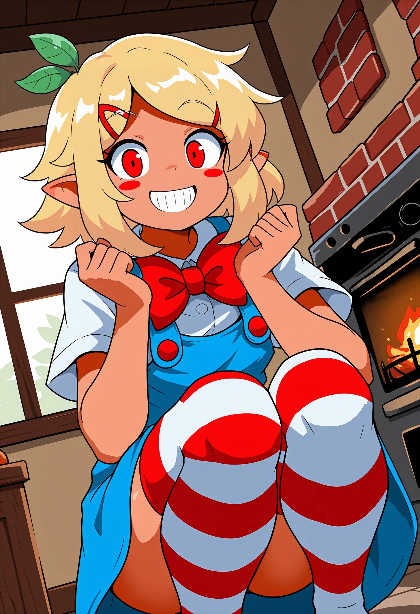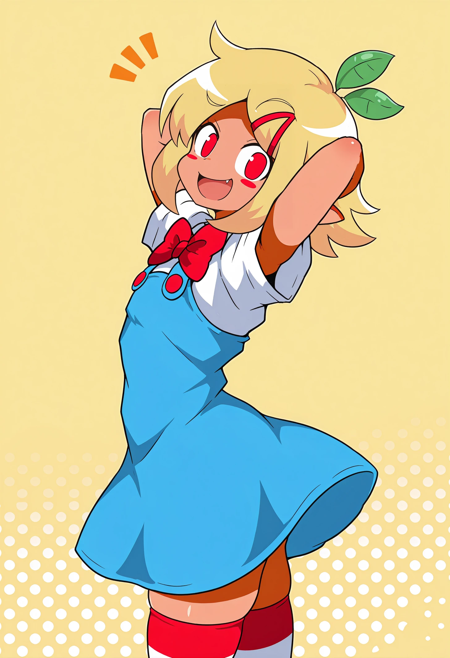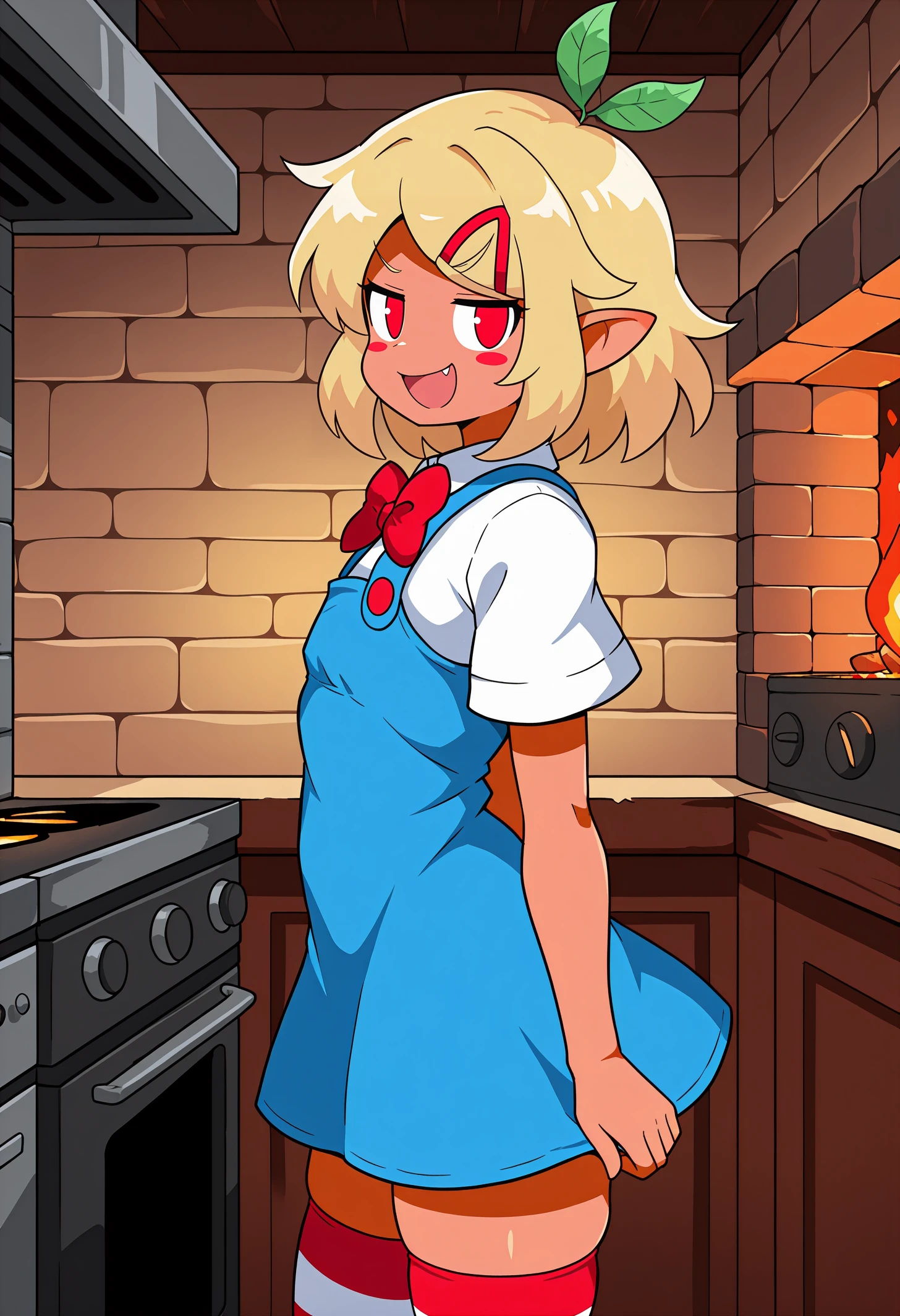 pztwpzhd, tan, short hair, blonde hair, hair ornament, medium hair, sidelocks, leaf, red eyes, pointy ears, blush stickers, hairclip,