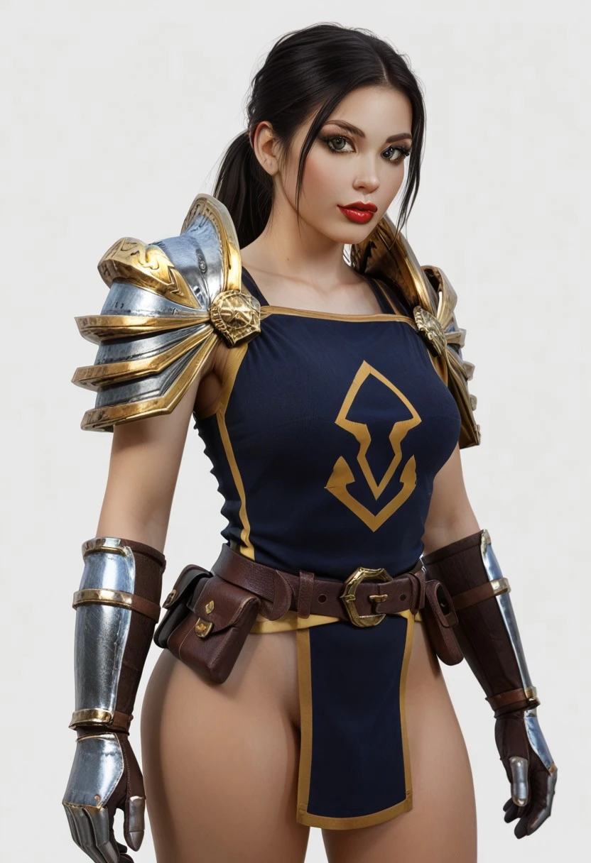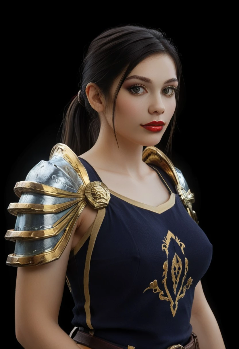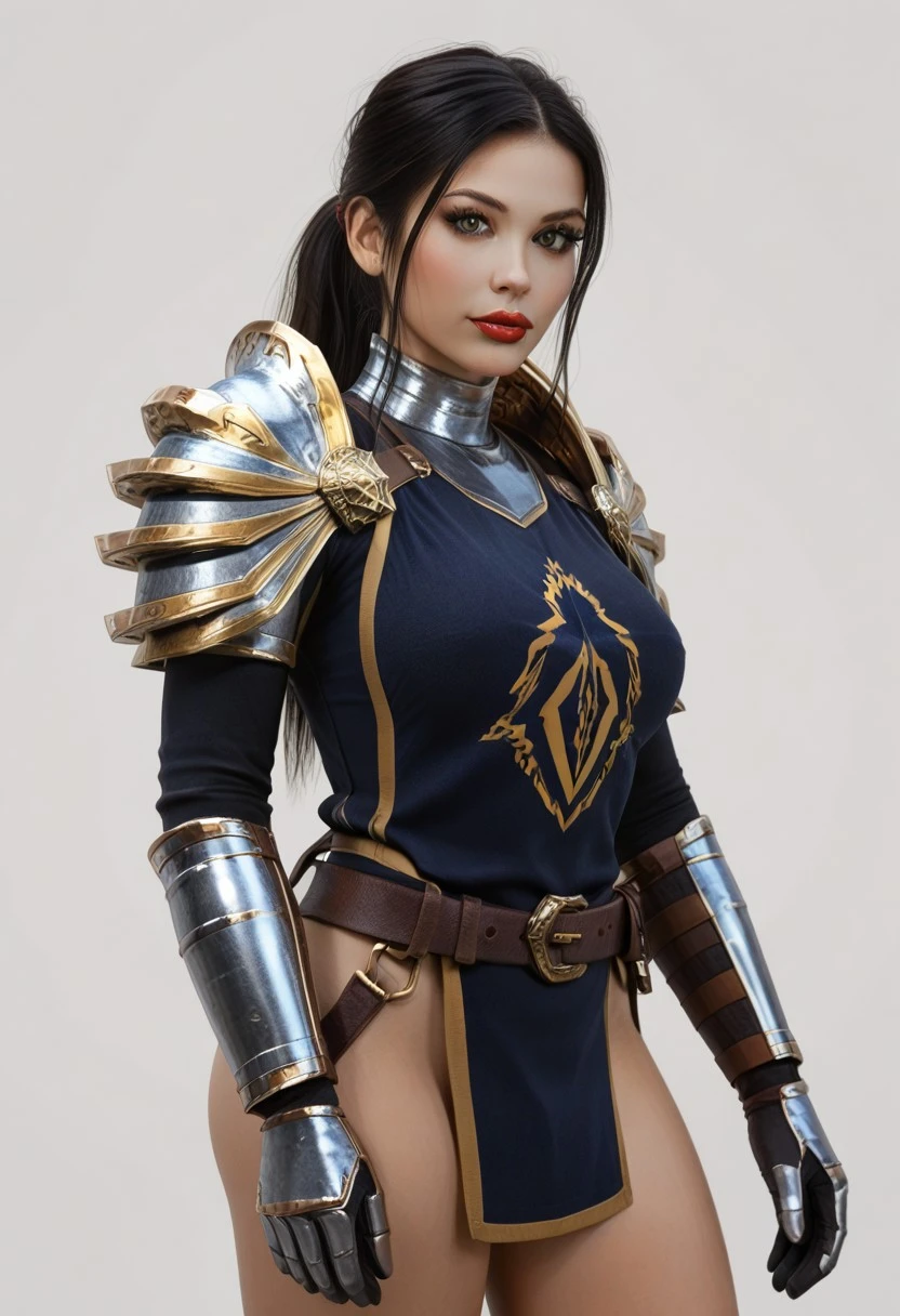 1girl,AReed,Black hair,ponytail,green eyes,,armour,shoulderpads,gauntlets,belt,tabard, lips,Thighhigh brown boots,