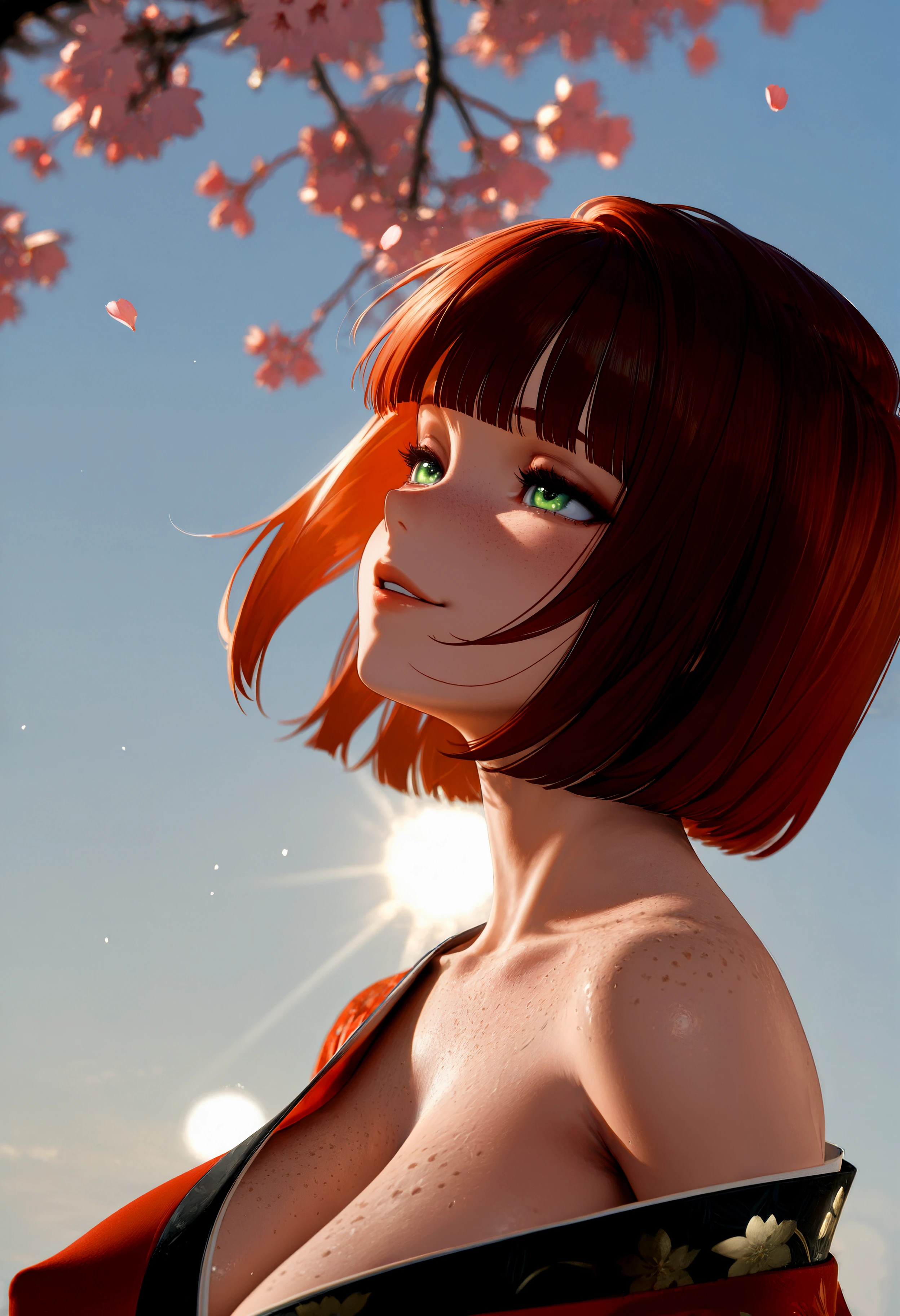 ripples_scarlett, milf, aged up, 1girl, freckles, green eyes, bob cut, short hair, blunt bangs, dark orange hair, huge breasts, body freckles, wide hips, (thick thighs:1.2),