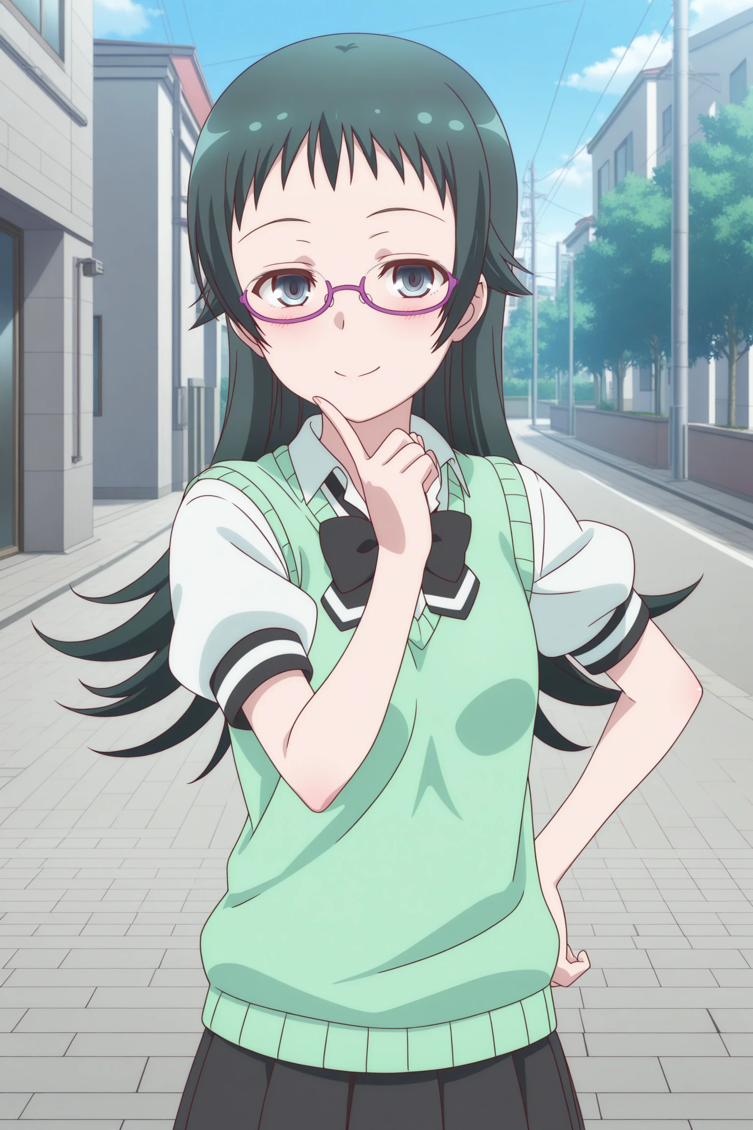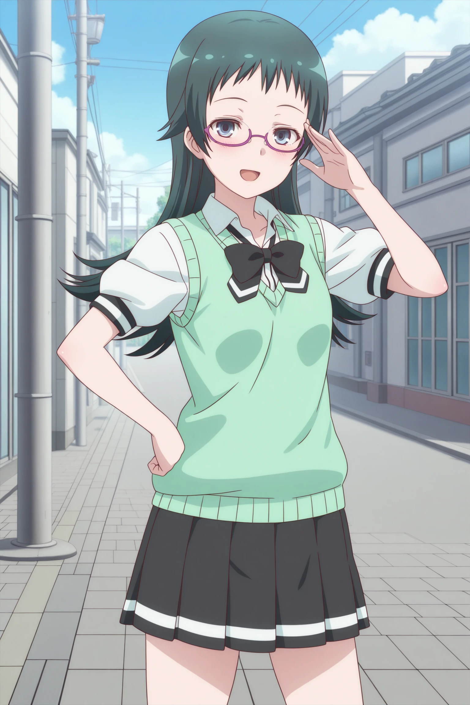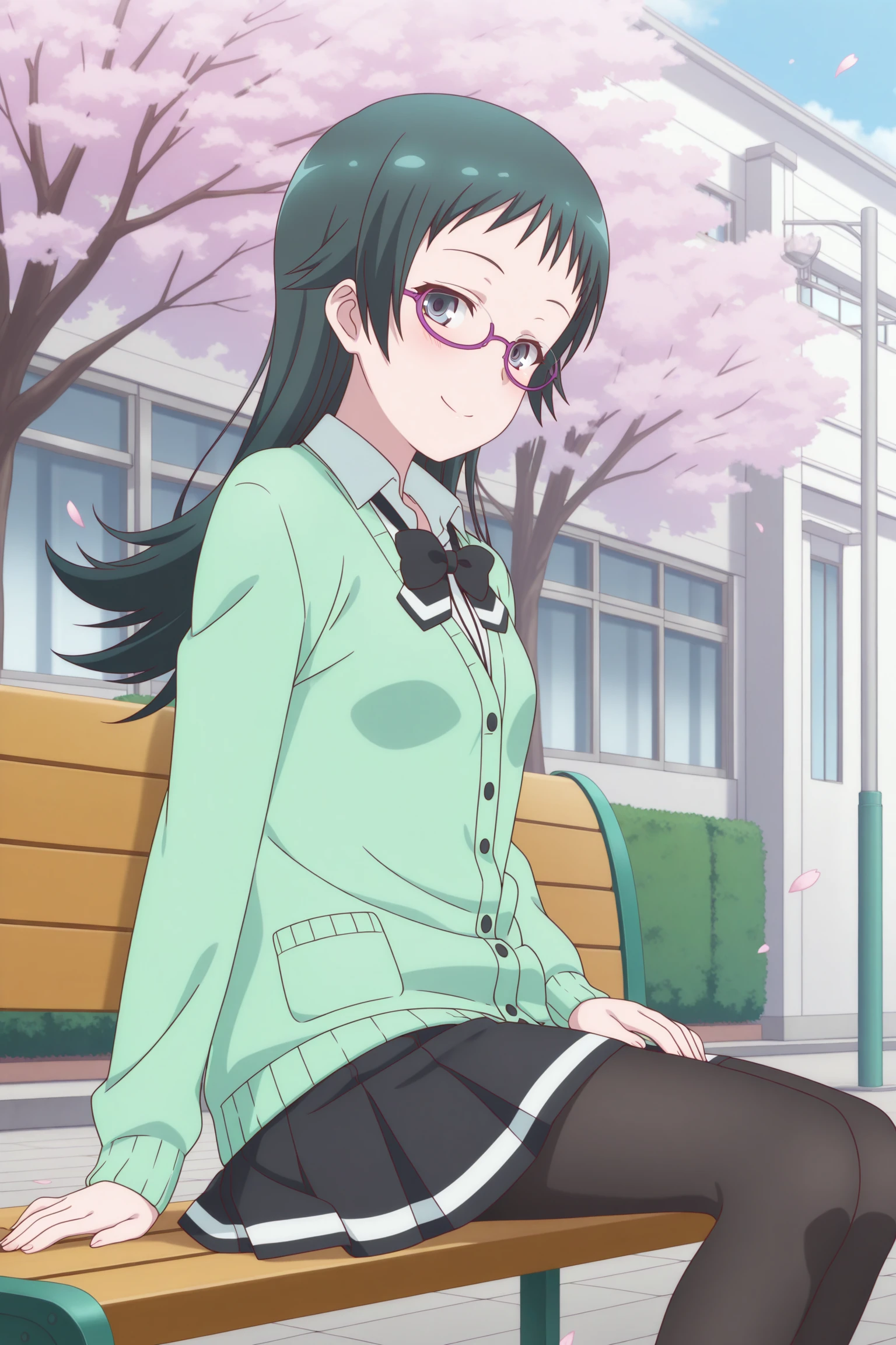 takahashi jun, long hair, green hair, sidelocks, short bangs, green eyes, under-rim eyewear, purple-framed eyewear, long sleeves, green cardigan, white shirt, collared shirt, black bowtie, loose bowtie, black skirt, striped skirt, pleated skirt, black pantyhose, brown shoes, loafersSchool Uniform (Summer)