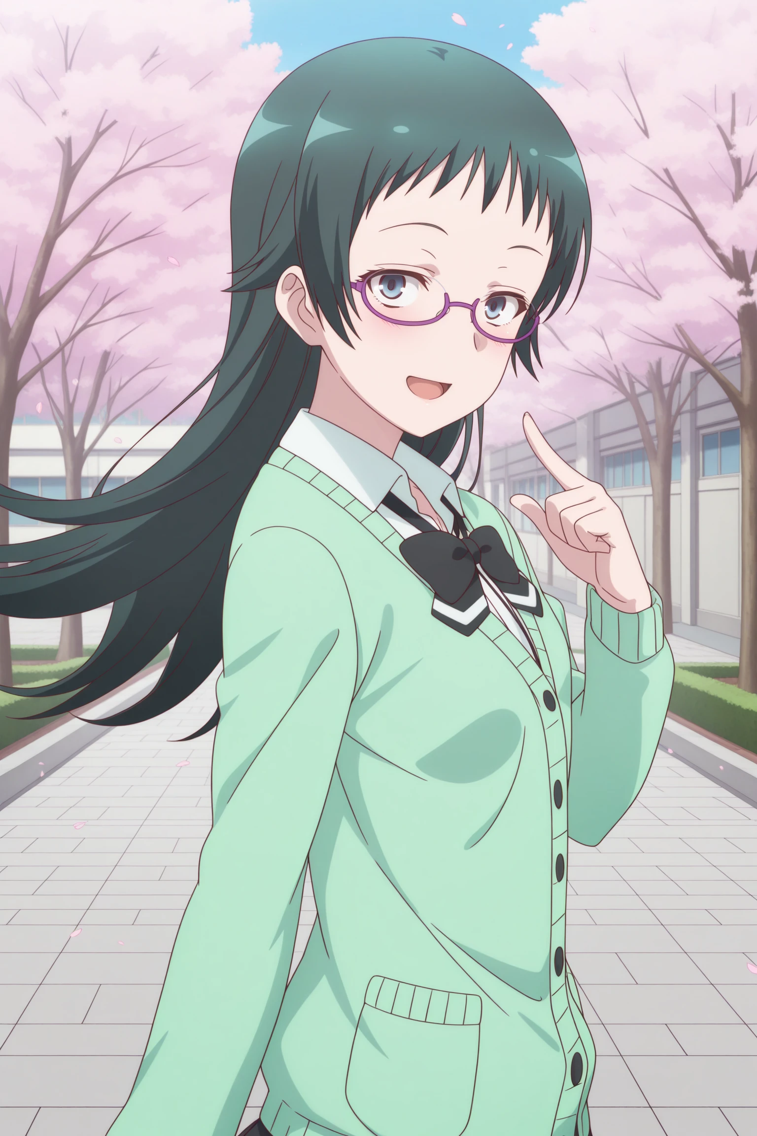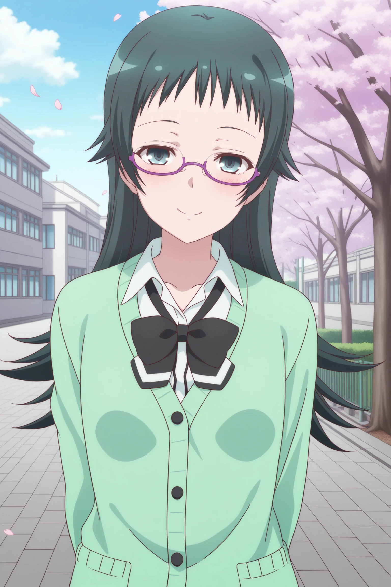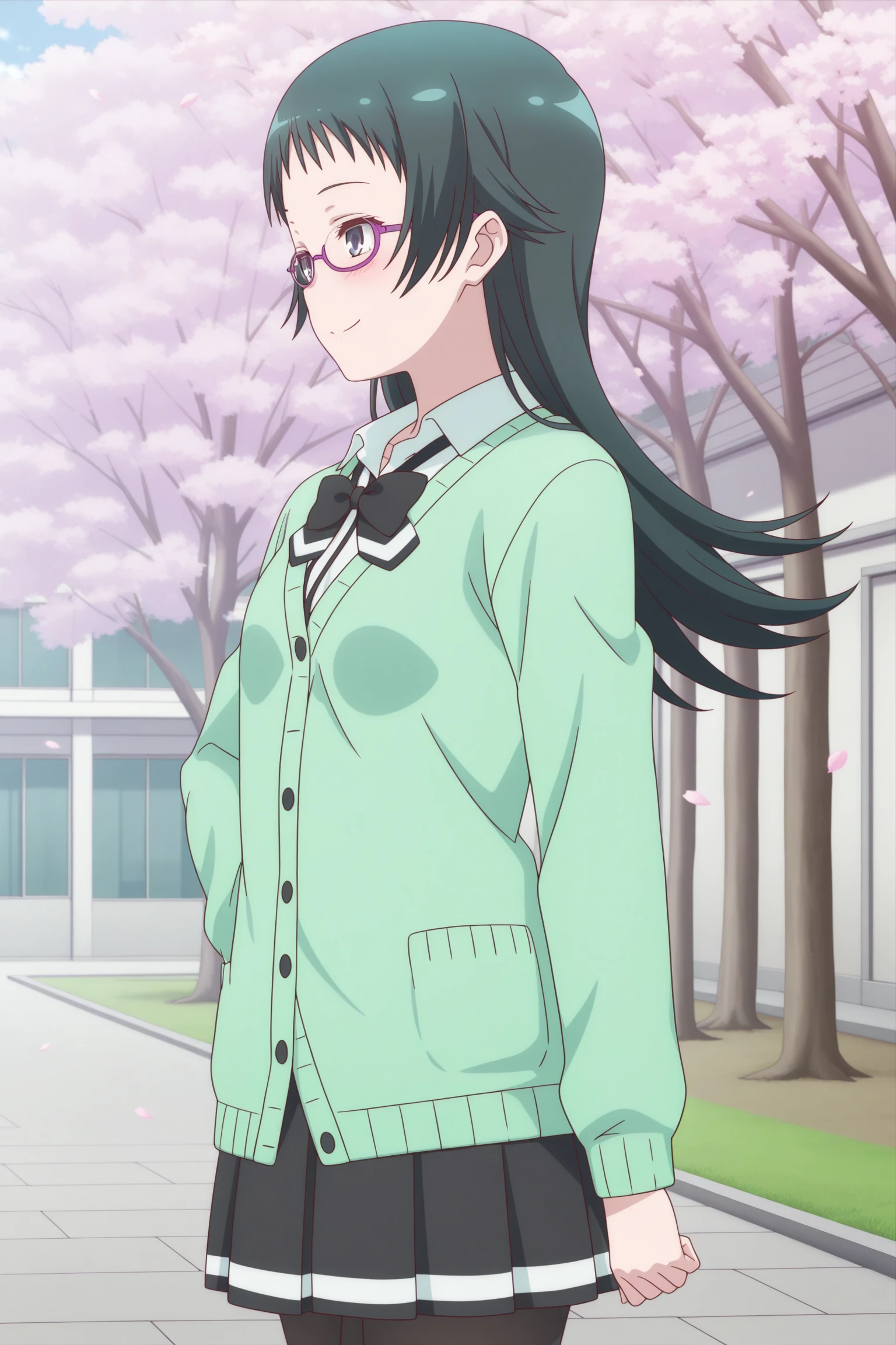 takahashi jun, long hair, green hair, sidelocks, short bangs, green eyes, under-rim eyewear, purple-framed eyewear, long sleeves, green cardigan, white shirt, collared shirt, black bowtie, loose bowtie, black skirt, striped skirt, pleated skirt, black pantyhose, brown shoes, loafersSchool Uniform (Summer)