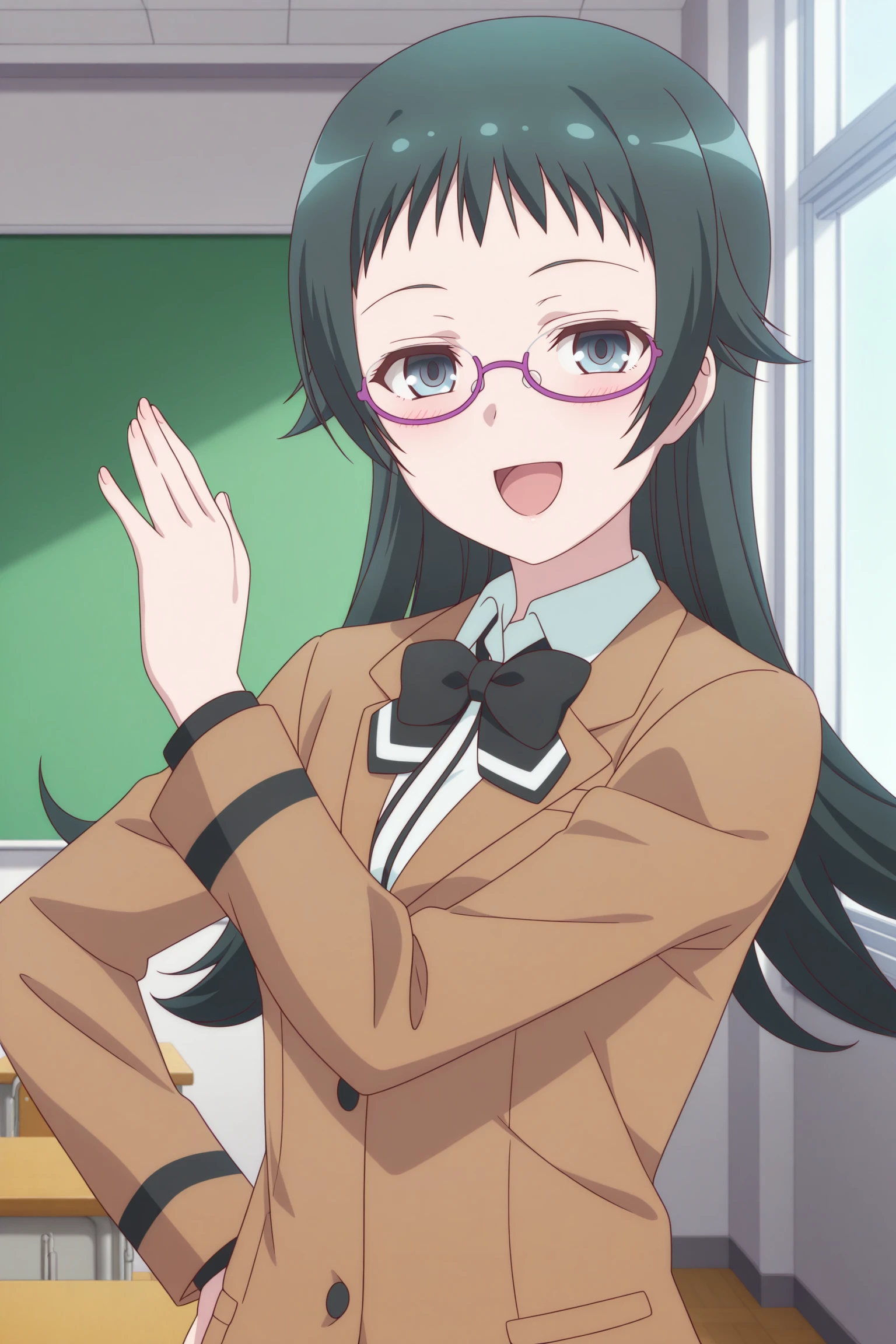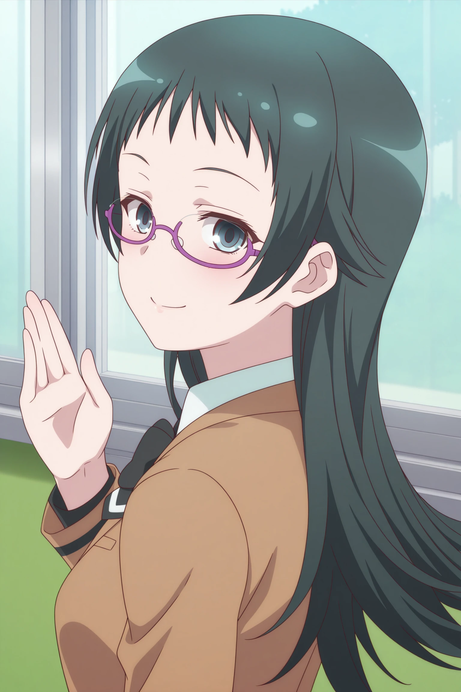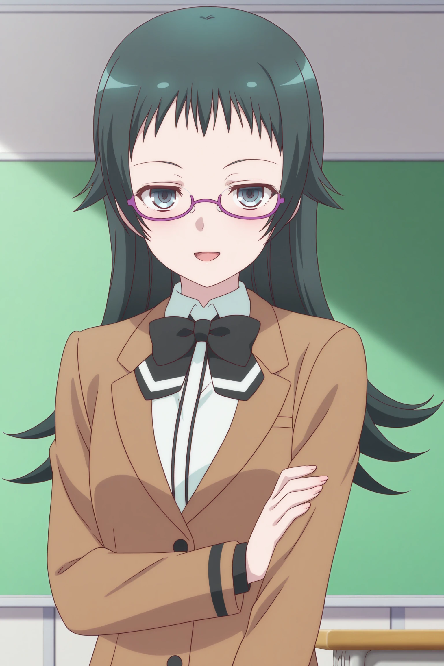 takahashi jun, long hair, green hair, sidelocks, short bangs, green eyes, under-rim eyewear, purple-framed eyewear, long sleeves, brown jacket, white shirt, collared shirt, black bowtie, black skirt, striped skirt, pleated skirt, black pantyhose, brown shoes, loafersSchool Uniform (Spring/Fall)