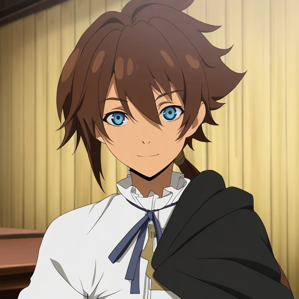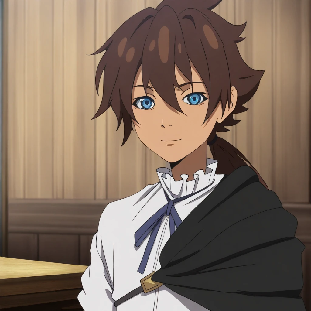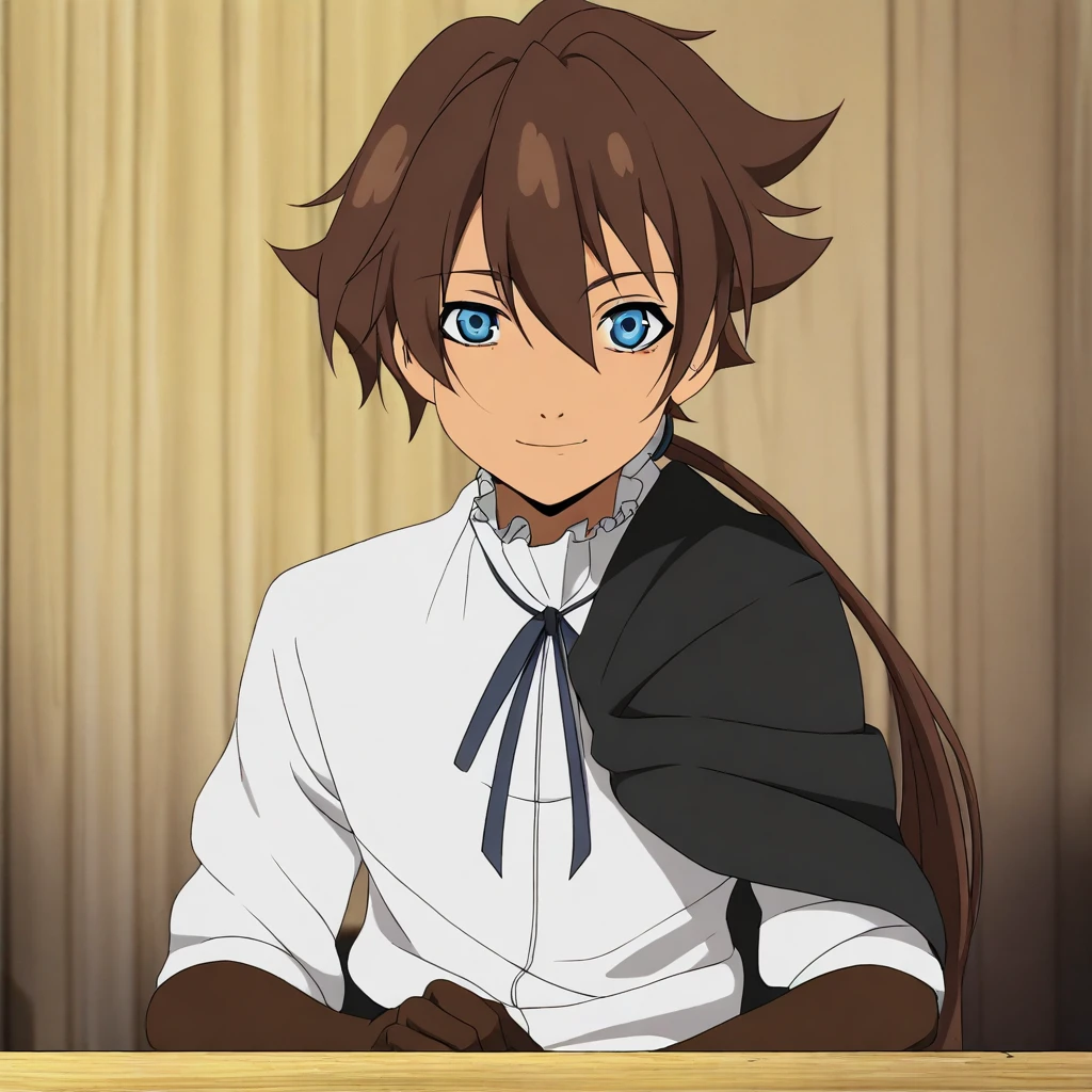 brown hair, long hair, bangs between eyes, low ponytail, blue eyes, artificial left eye,