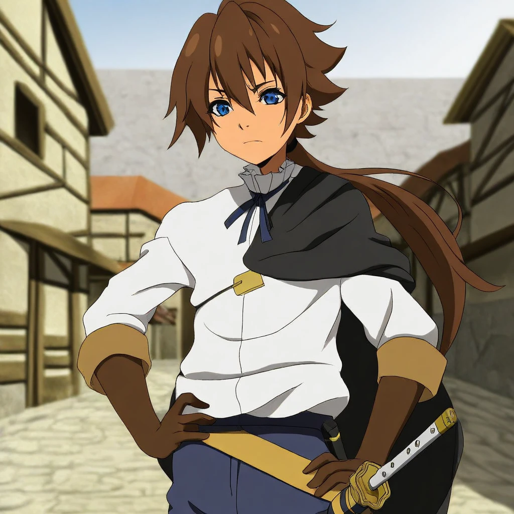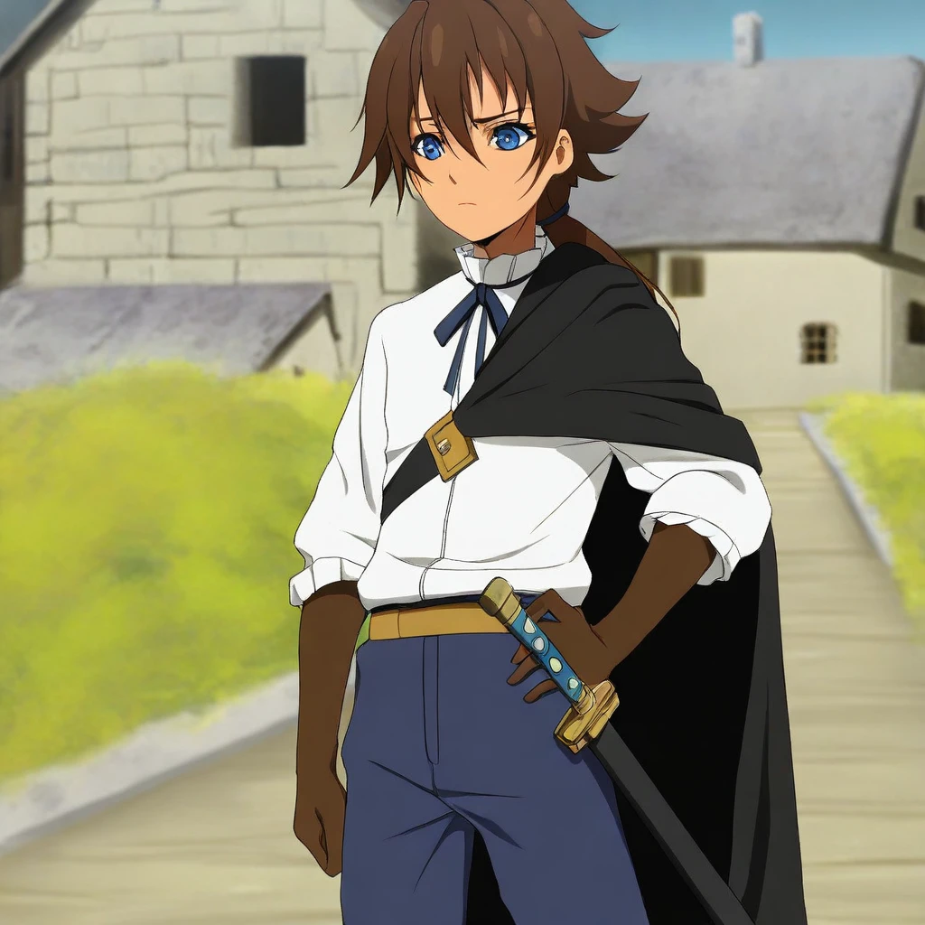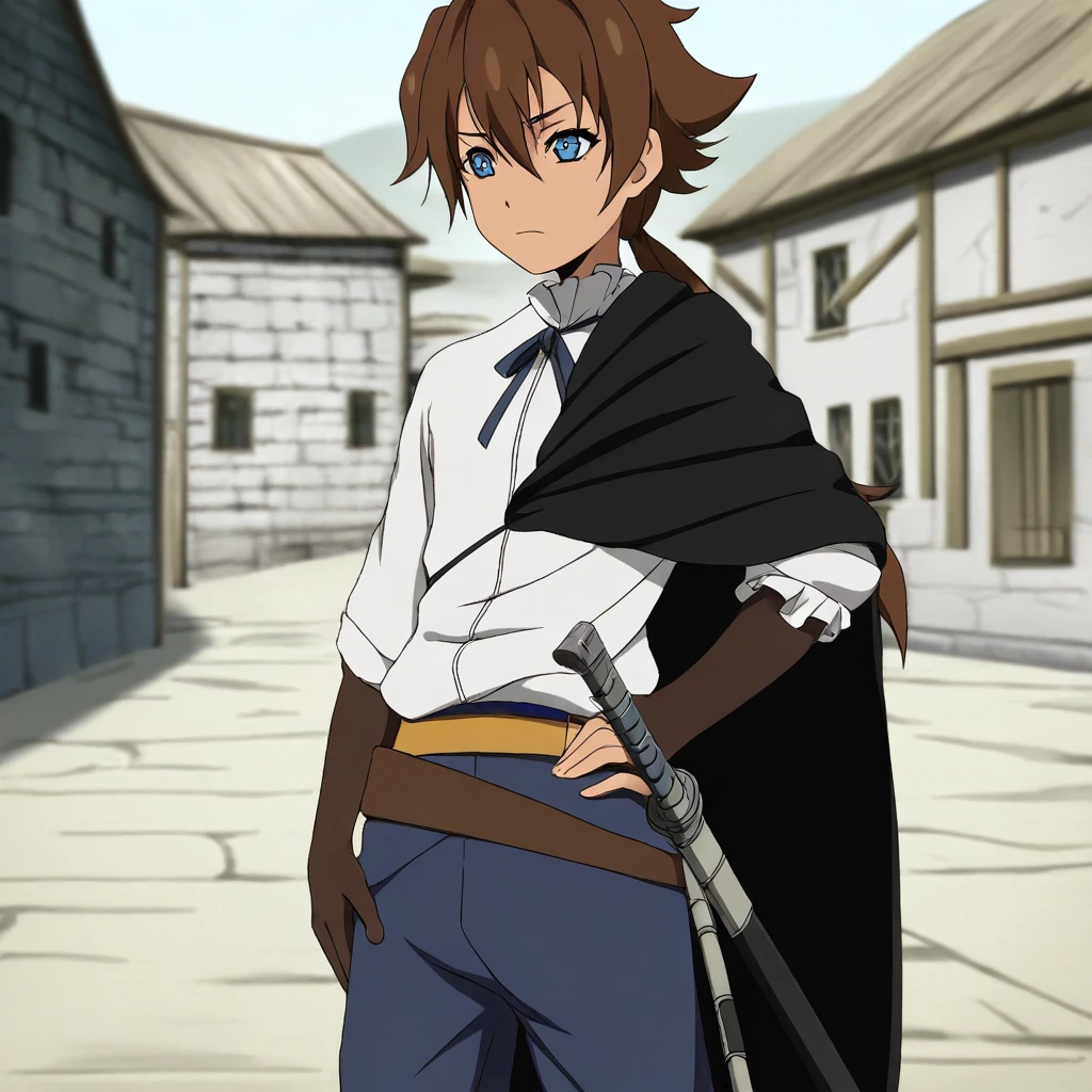 white shirt, dark-blue neck-ribbon, black shoulder-cape, brown elbow-glove (single), belt, sheath, dark-blue pants,