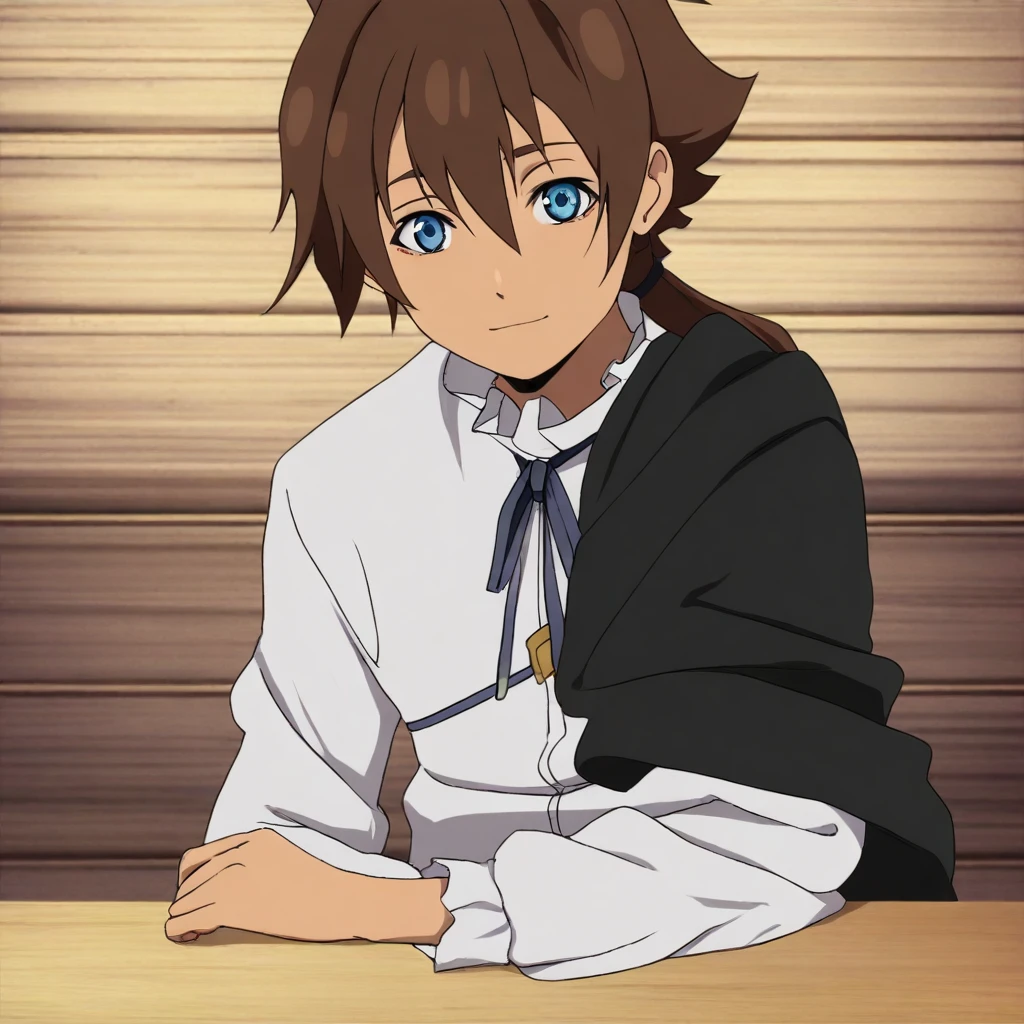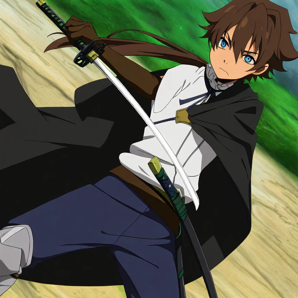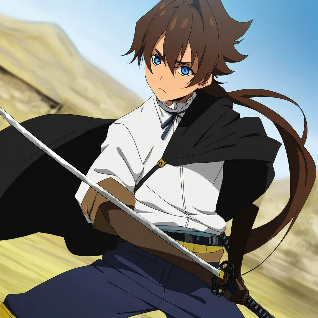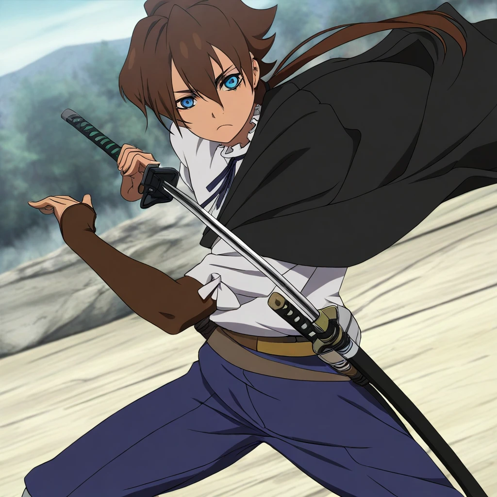white shirt, dark-blue neck-ribbon, black shoulder-cape, brown elbow-glove (single), belt, sheath, dark-blue pants,