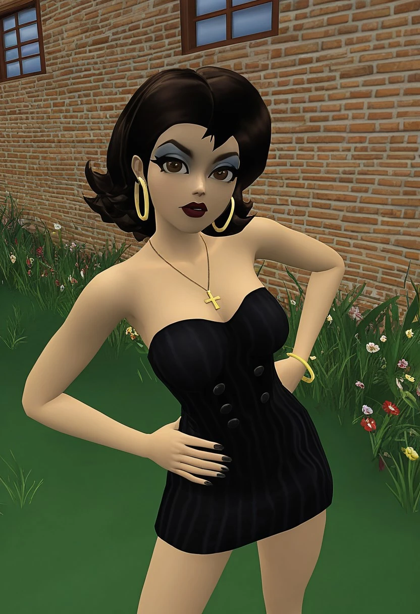 strapless_dress, bare_shoulders, high_heels, strapless, black_dress, short_dress, cleavage, 3d, high definition, cartoon_style, ultra-detailed