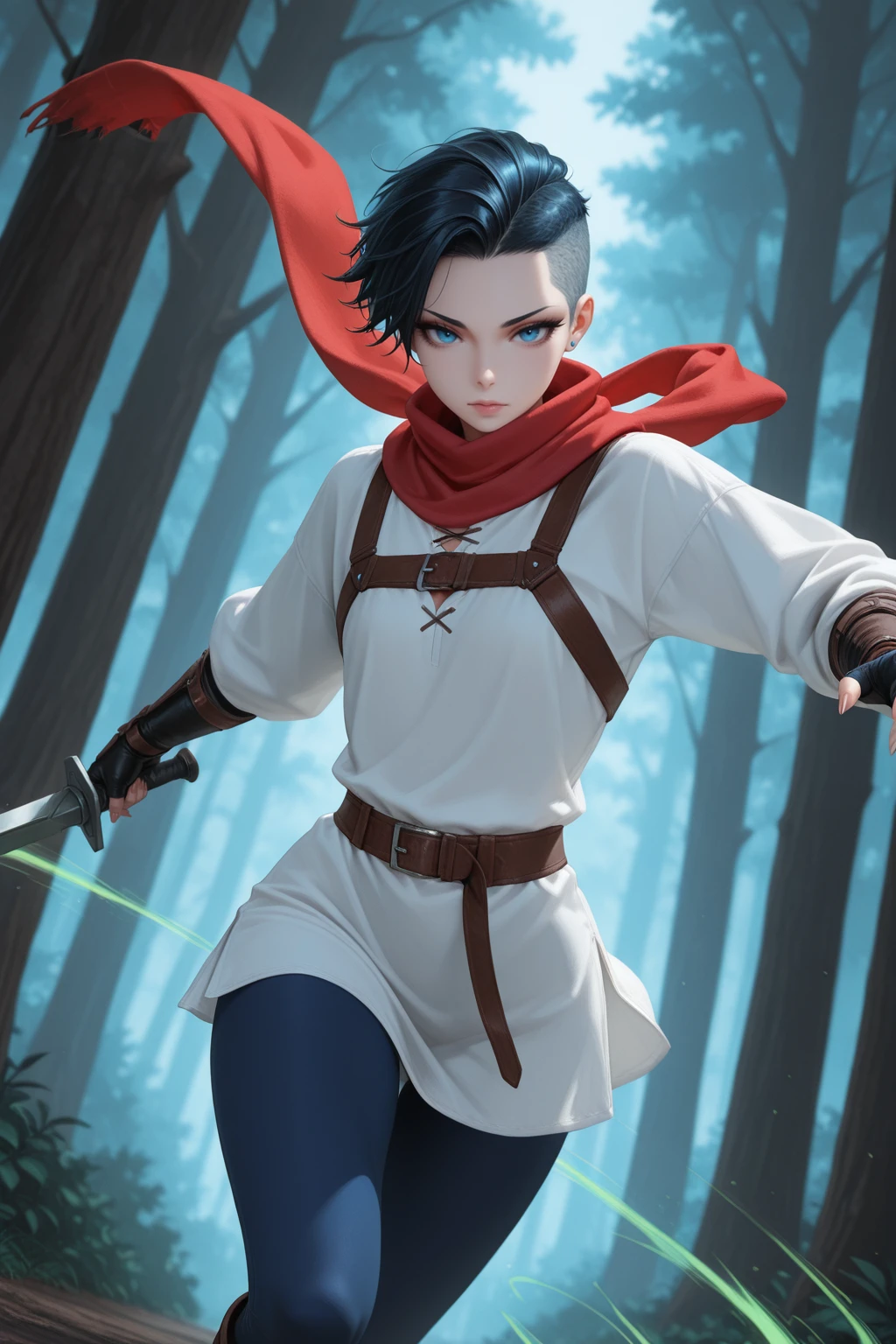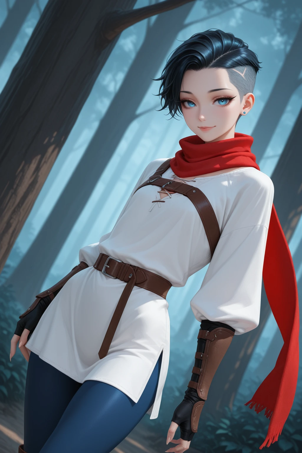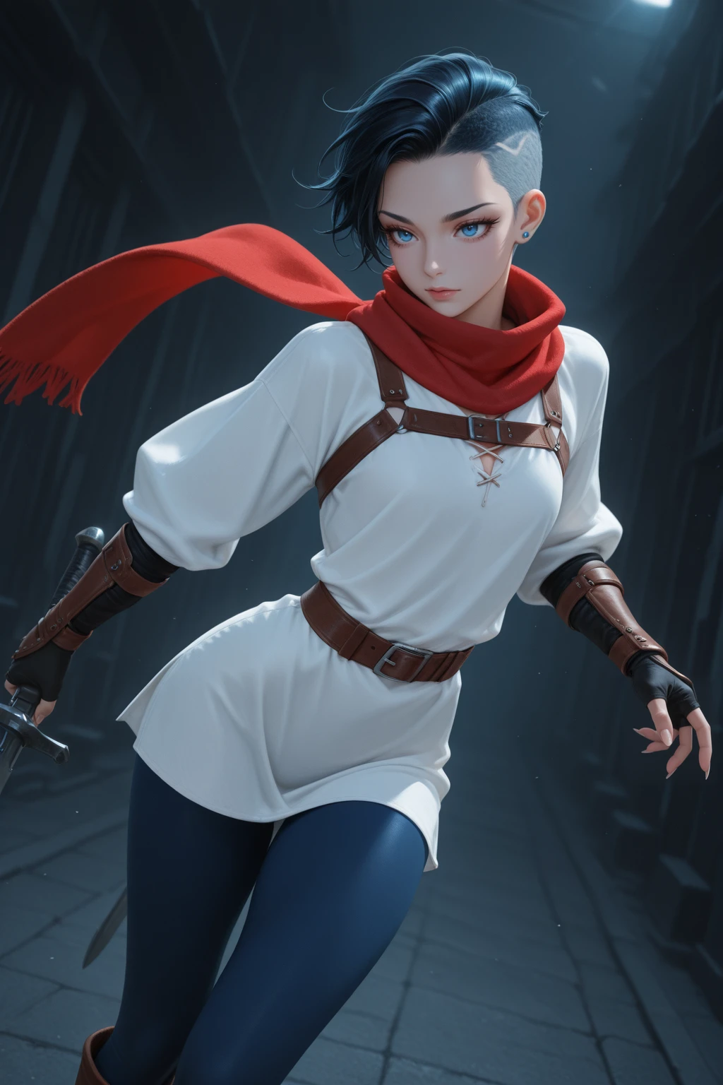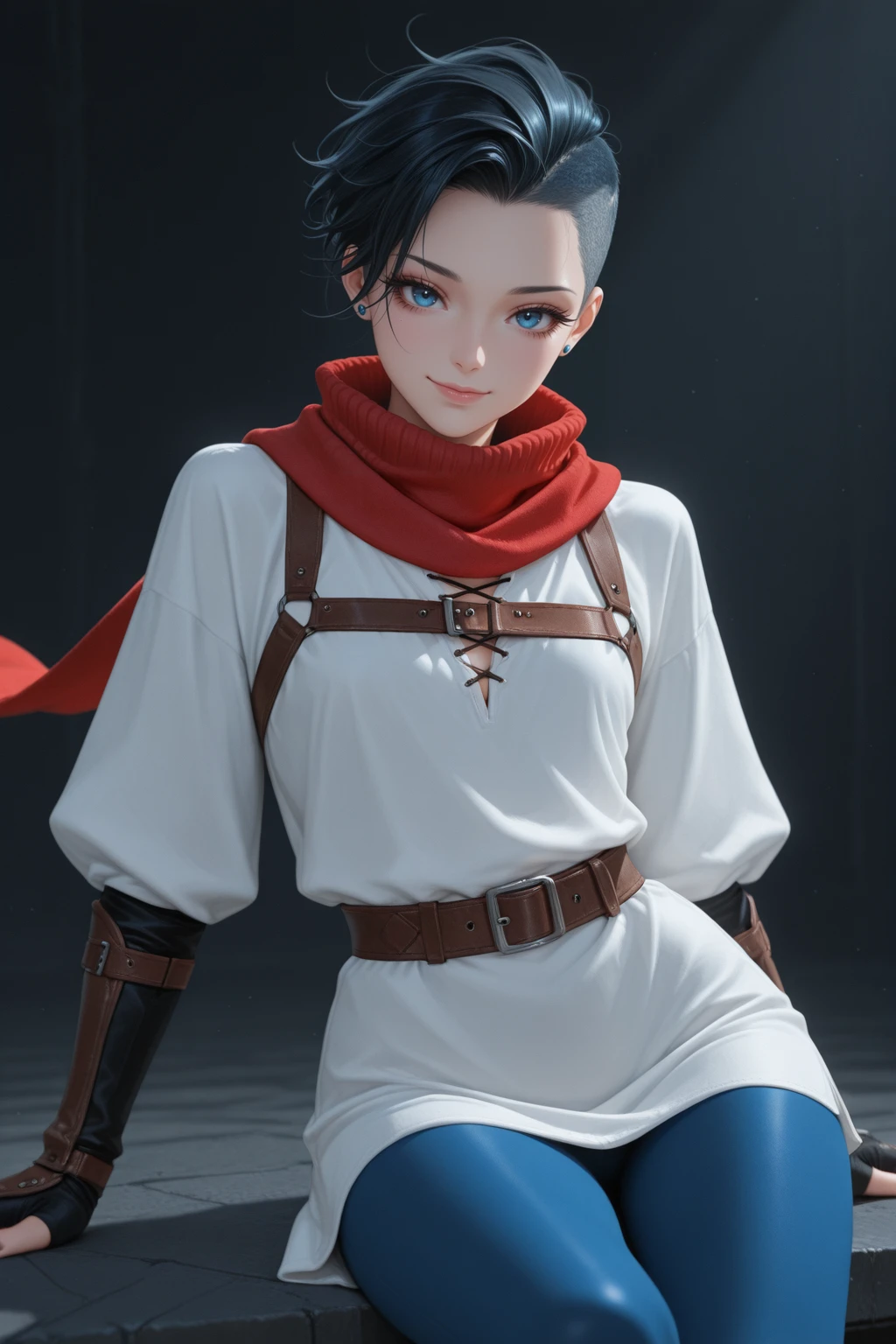 White Tunic Shirt, Red Scarf, Leather chest strap, brown belt, Blue Leggings, Black fingerless bracers, Brown Leather boots, blue stud Earrings,