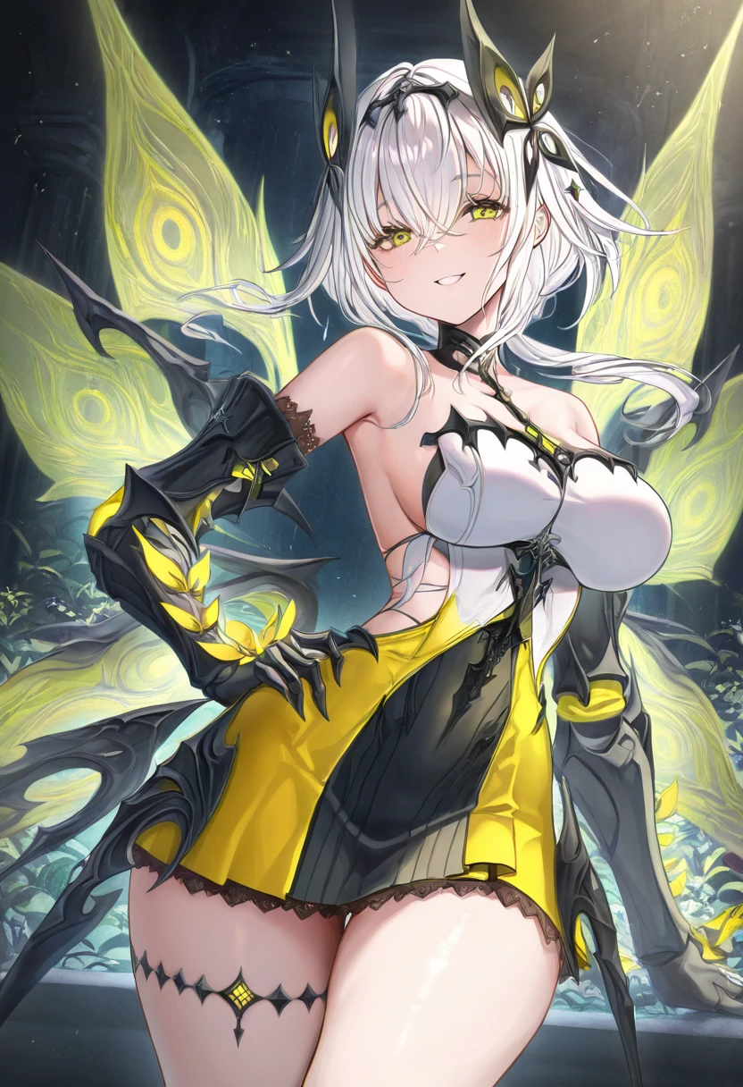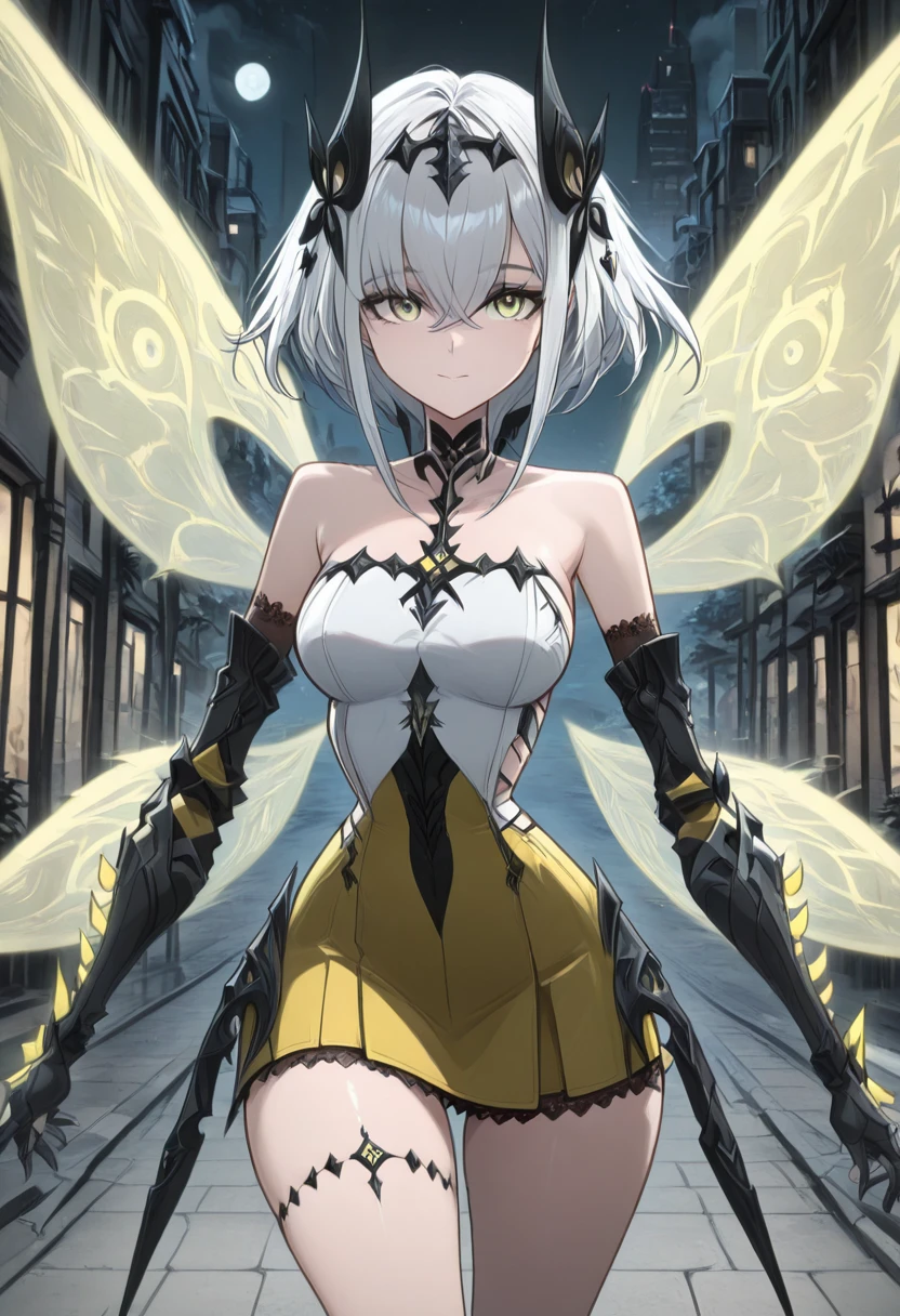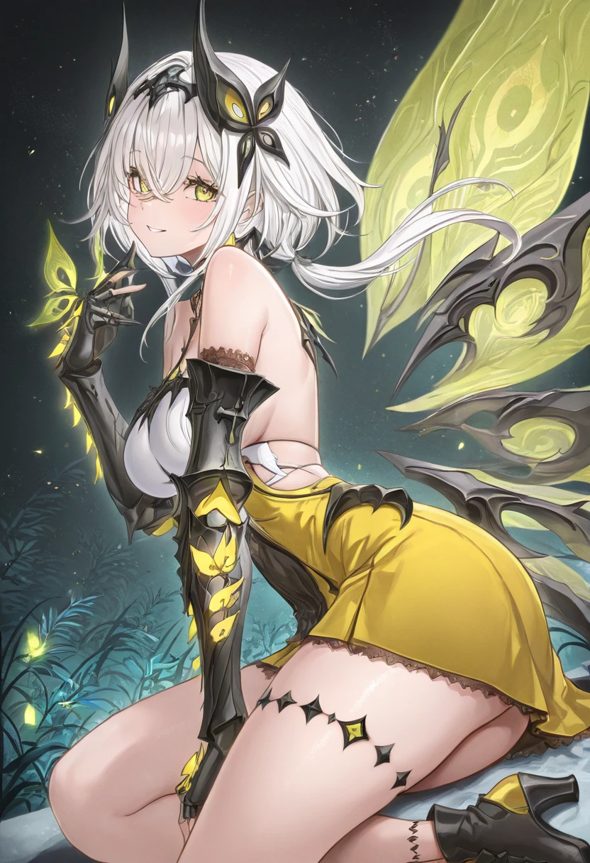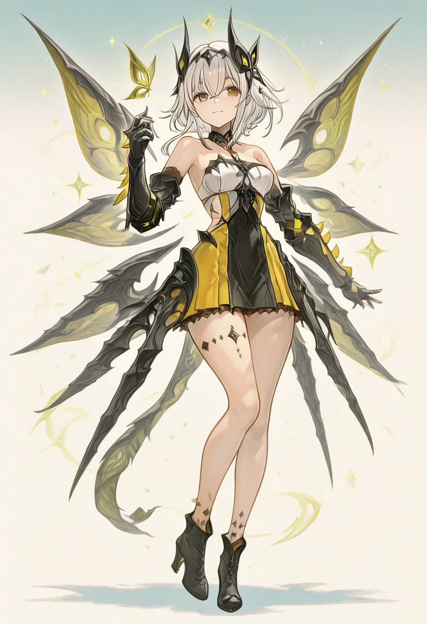zzPsyche, yellow eyes, green eyes, white hair, medium hair, bangs, hair ornament, hair between eyes, yellow dress, shoulders, boots, wings, elbow gloves, high heels, gauntlets,